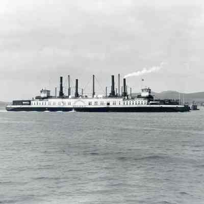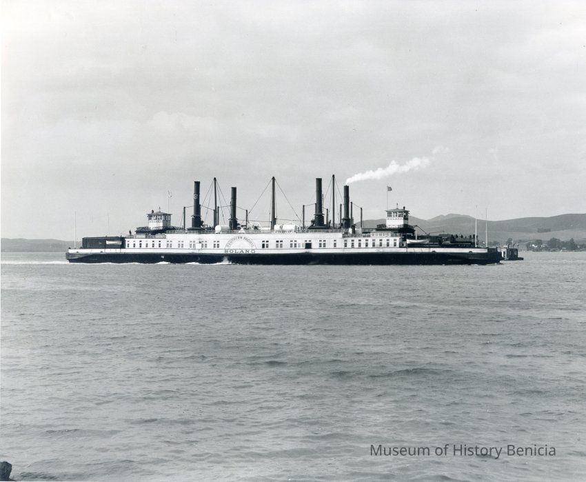 Photo of the ferry boat Solano under steam in the Carquinez Strait.The back of the photo has a sticker identifying this as a Southern Pacific photo.Collection