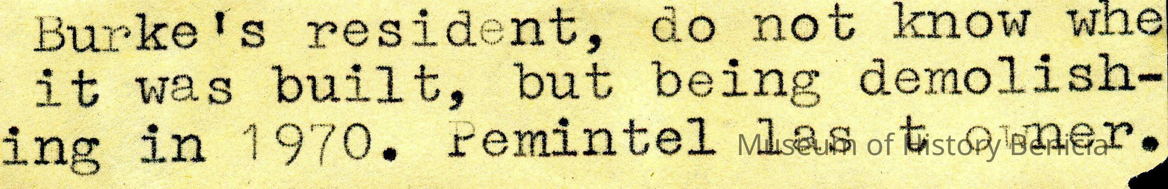 B/W photograph of Burke's resident, do not know when it was built, being demolished in 1970. Pemintel was the last owner.Collection