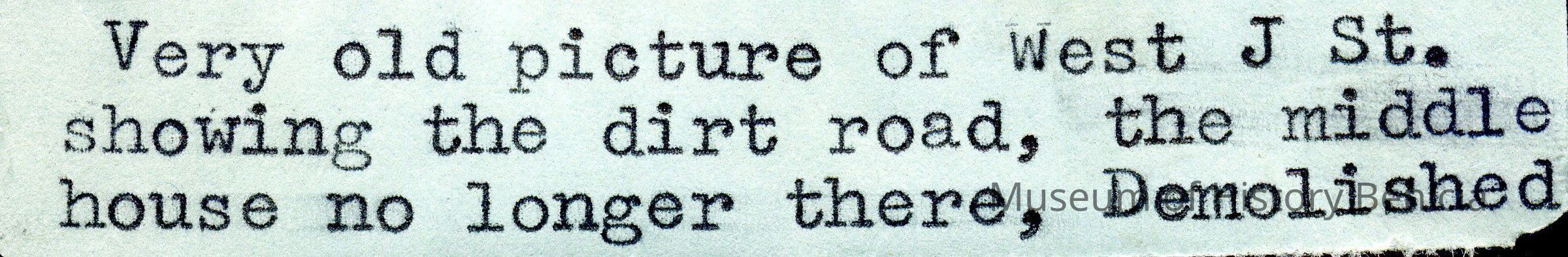 B/W photograph of West J St. showing the dirt road, the middle house no longer there (demolished).Collection