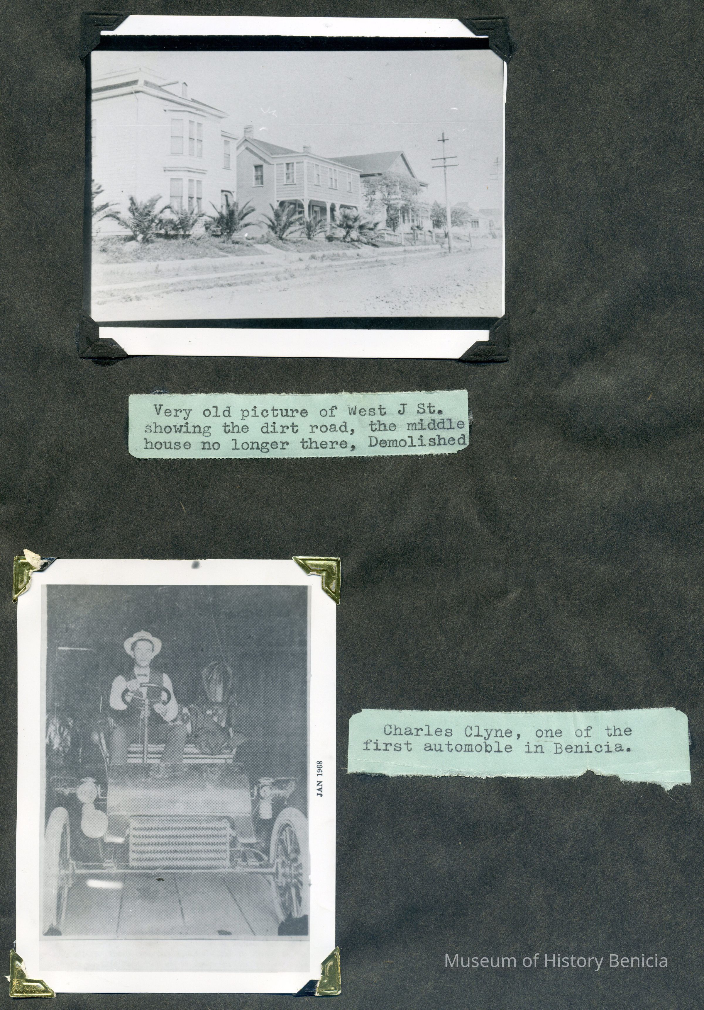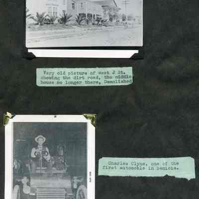 B/W photograph of West J St. showing the dirt road, the middle house no longer there (demolished), and Charles Clyne, on one of the first automobiles in Benicia.Collection