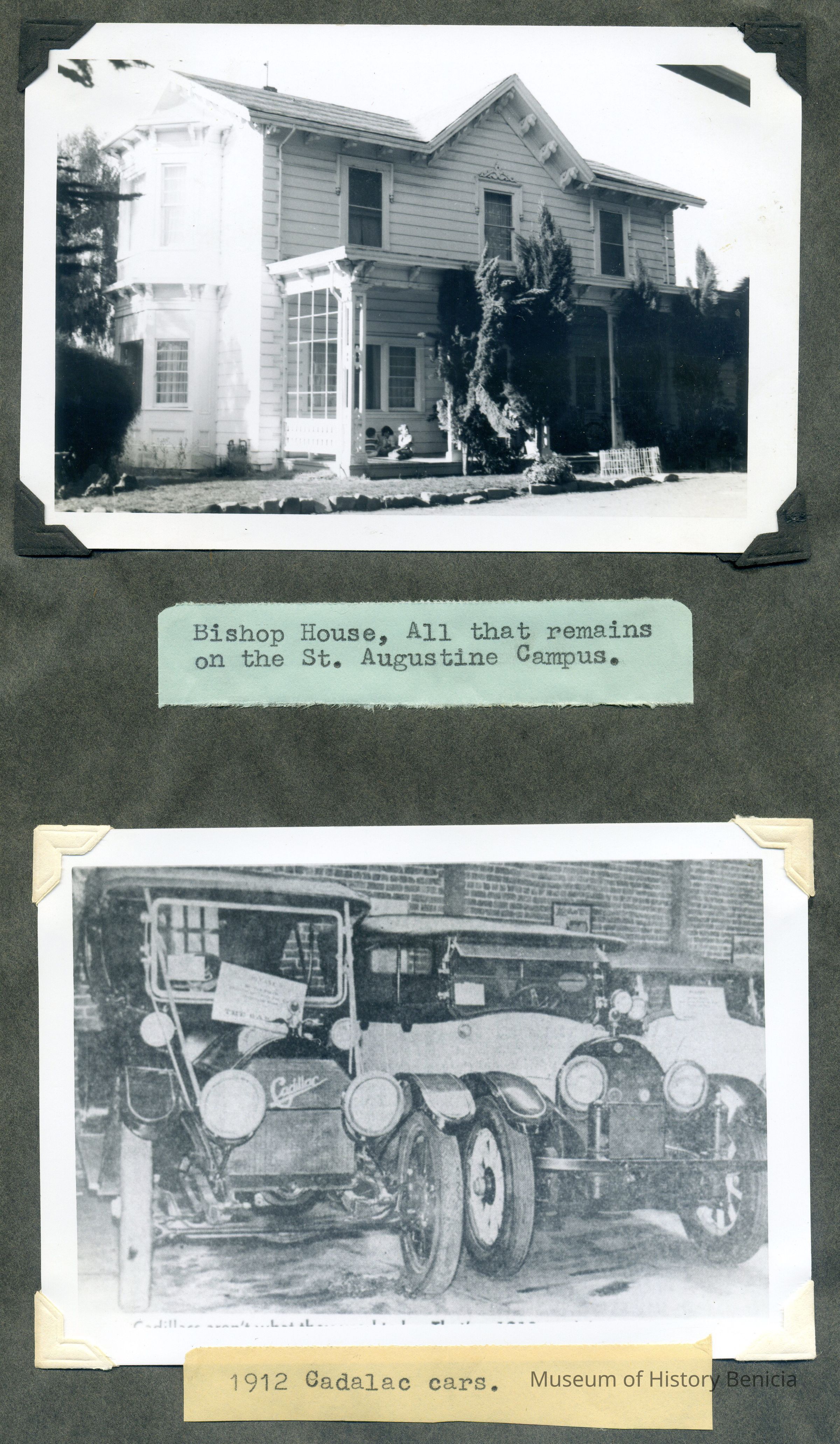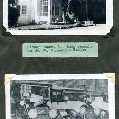 B/W photograph of Bishop House (all that remains on the St. Augustine Campus) and 1912 Cadillac cars.Collection