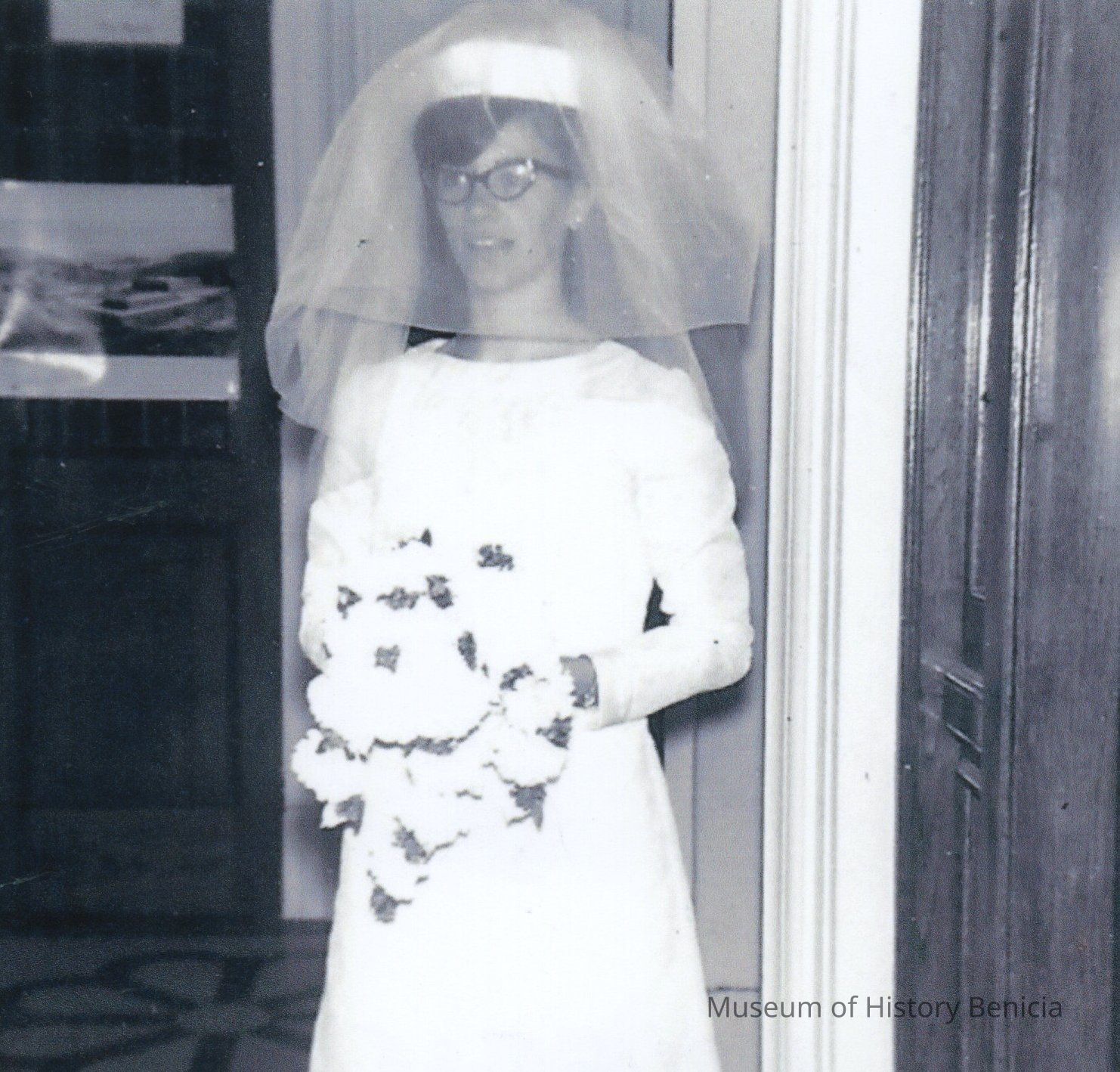 B/W Photograph of Roberta Marchioni in the vestibule at St. Dominic's Church just prior to her marriage to James Garrett in April 1967.Collection