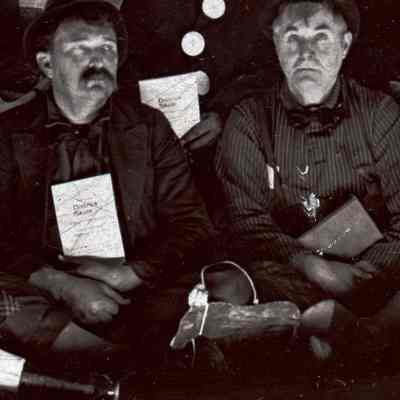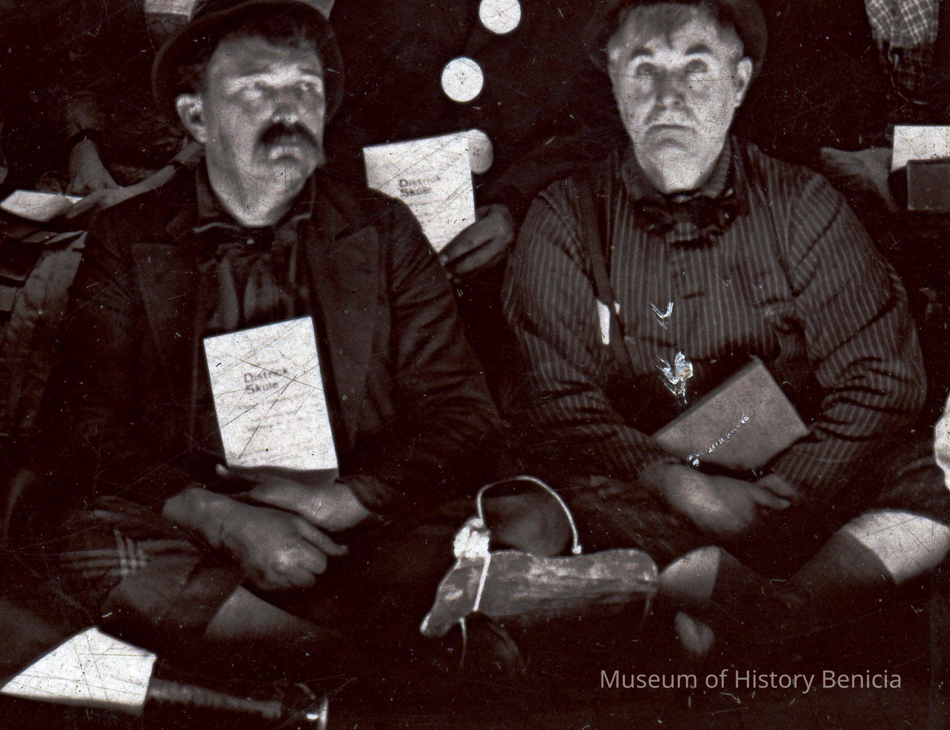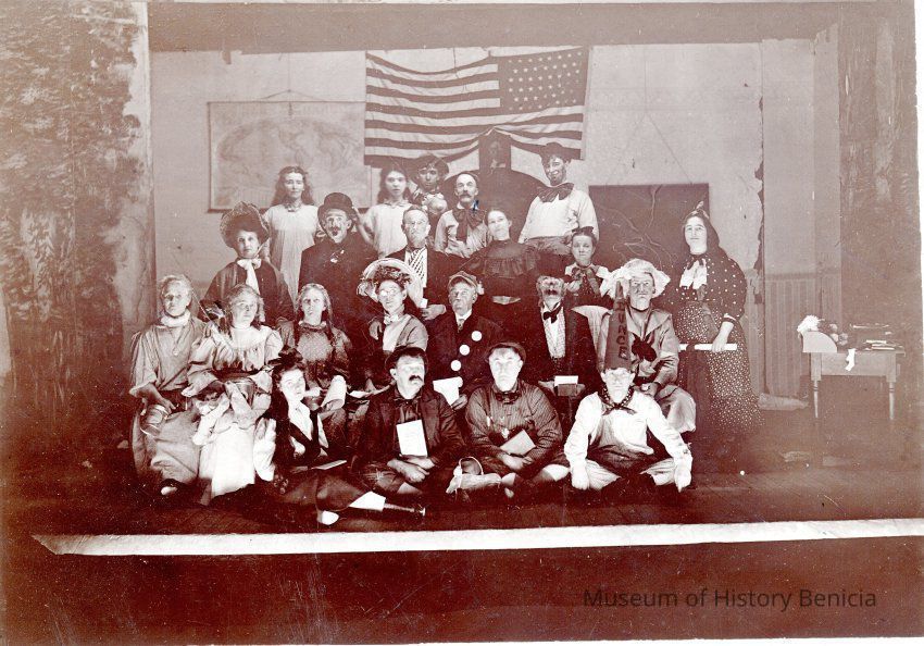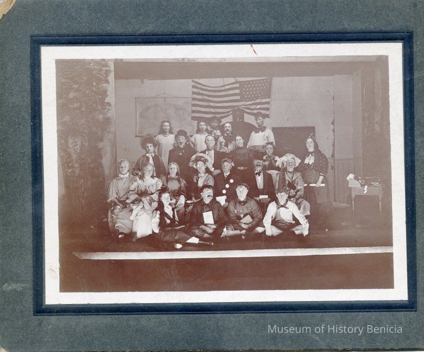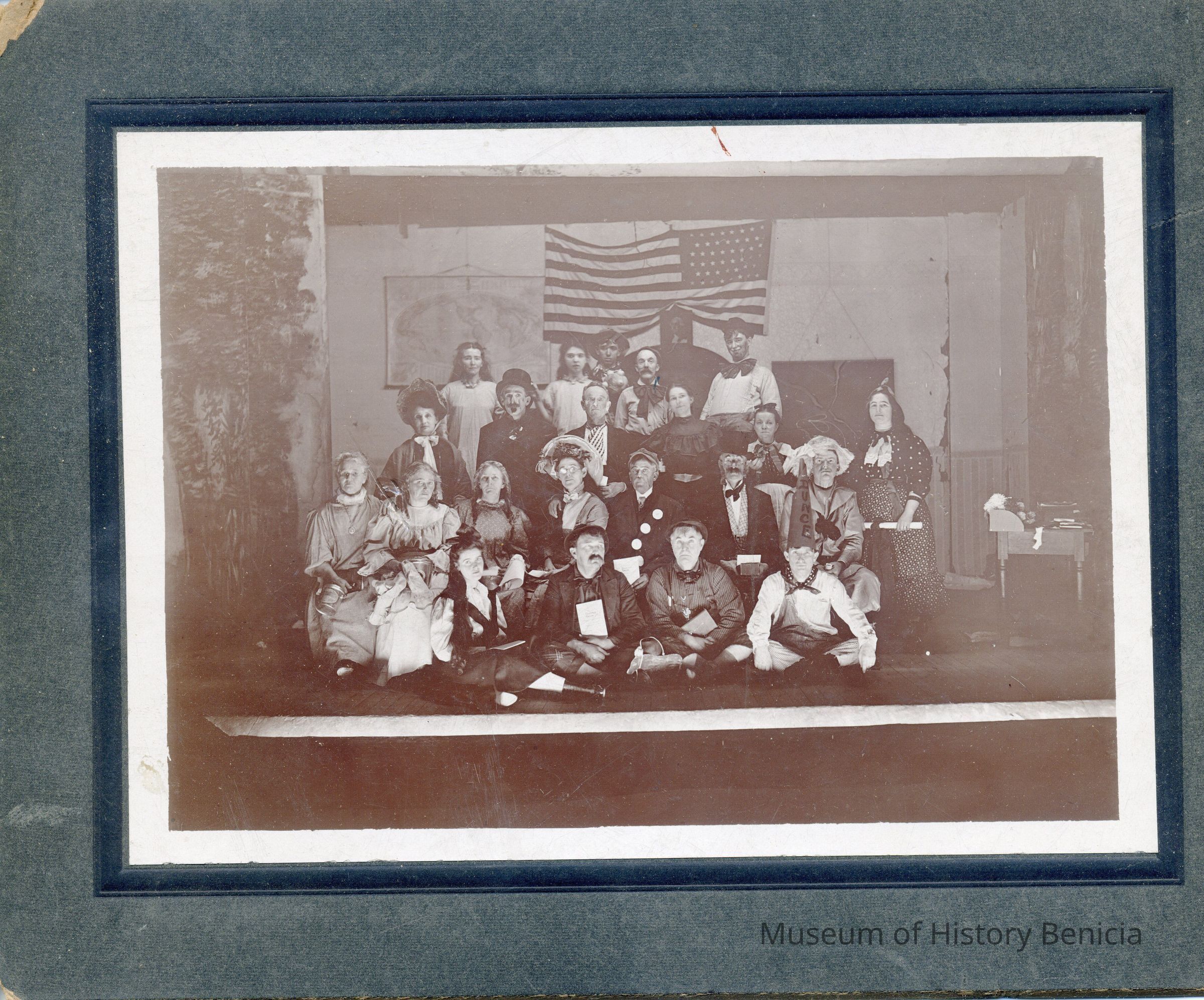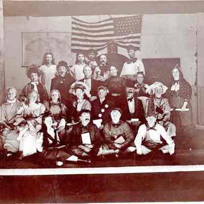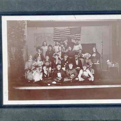 A cabinet card of a group of people on a stage with the American flag in the background, a map of the world, a picture of George Washington and maybe a piano. The people seem to be dressed in costumes and many have a paper in their hands. The paper held by the man sitting on the floor in the center says "Districk Skule". This may be the plays that the group was performing (see below).