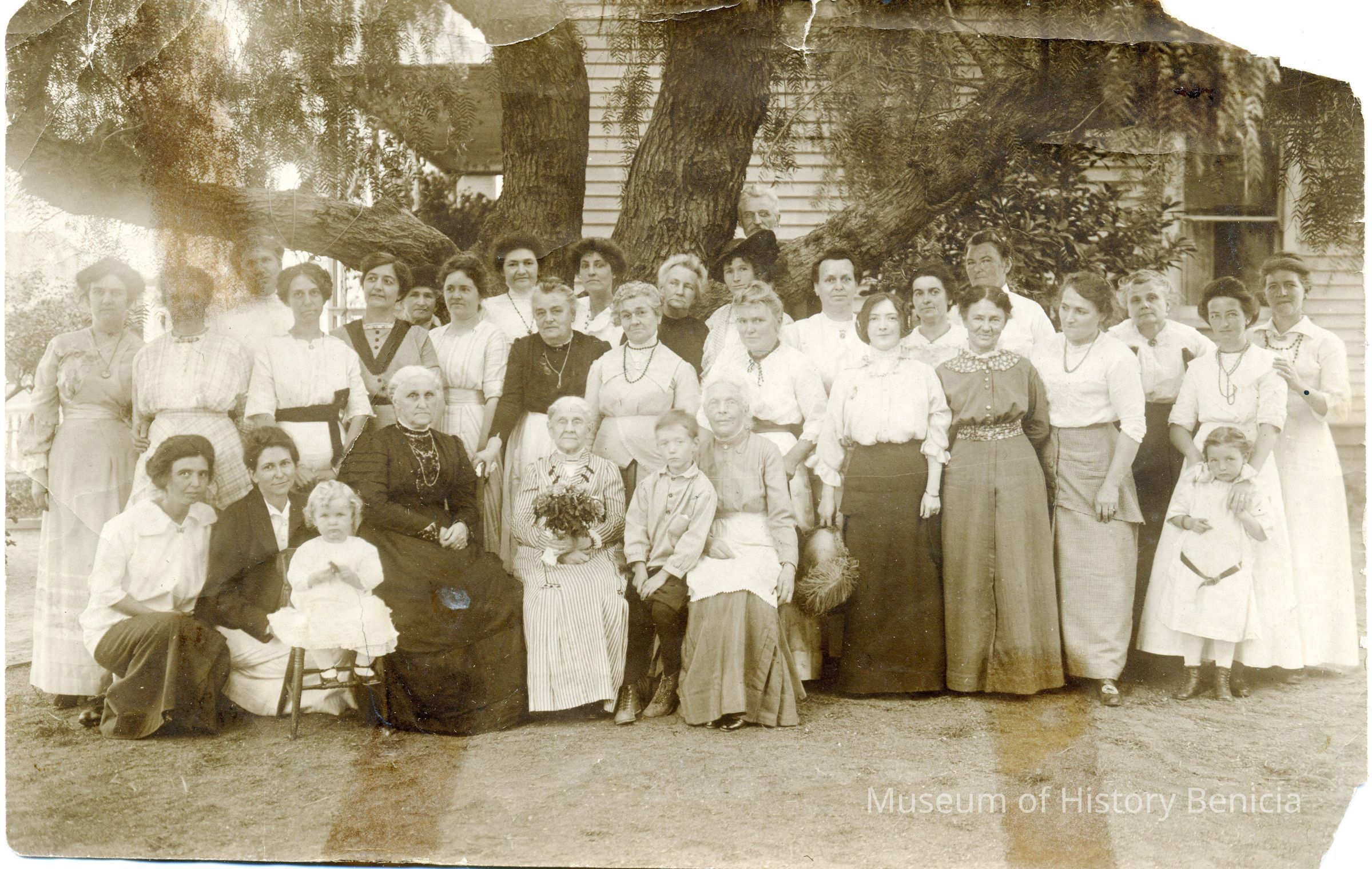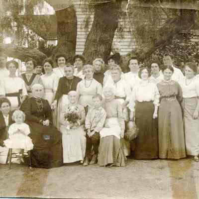 A photo of a large group of people, mostly women. There are only two men and a young boy. Looks like people at a family gathering. The back has a "Rankin's Grocery Benicia, Calif" stamp. There are several pieces of tape on the back.Collection