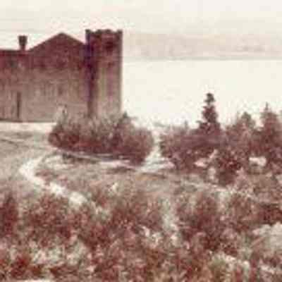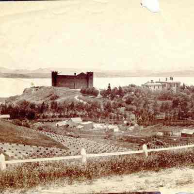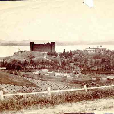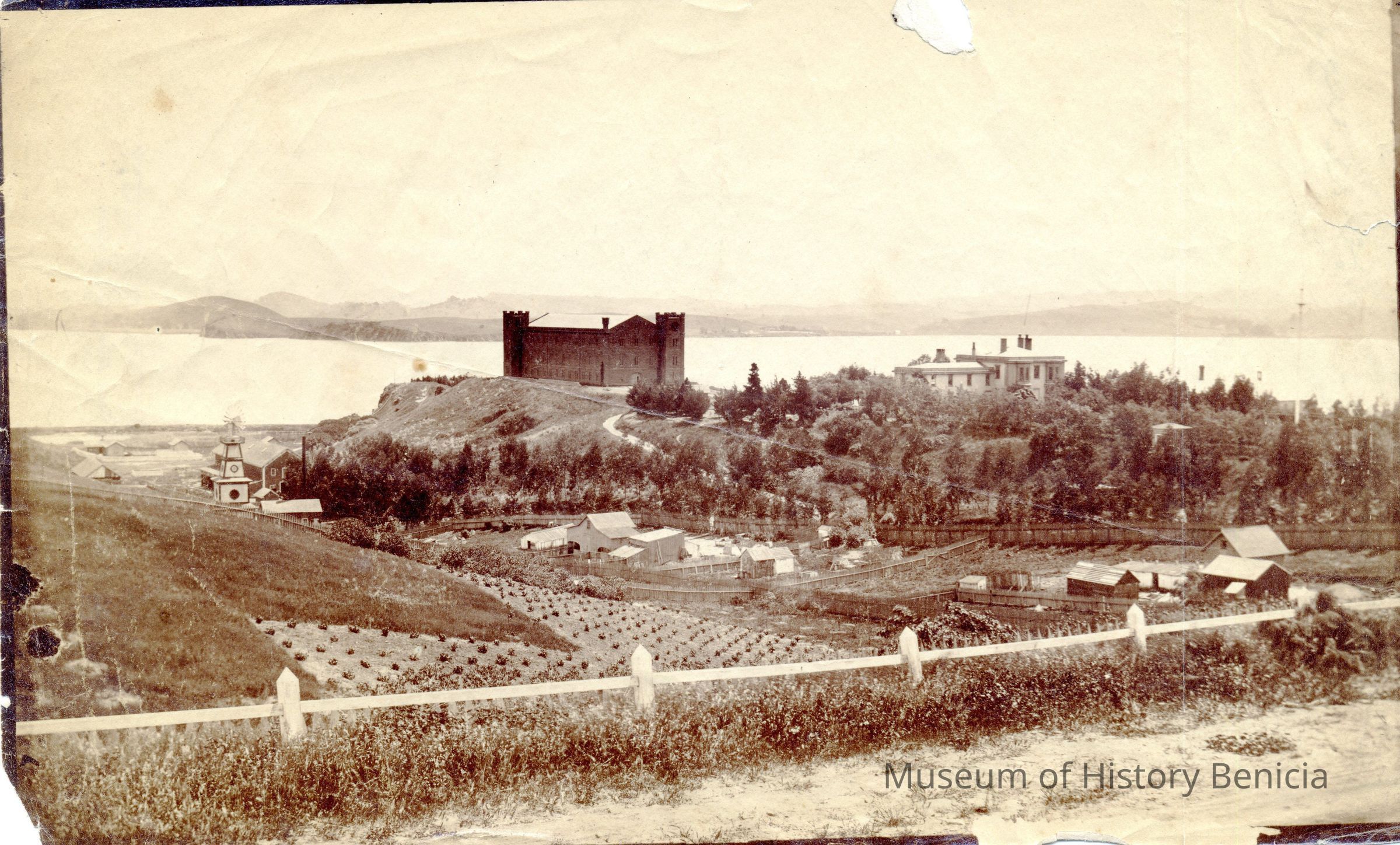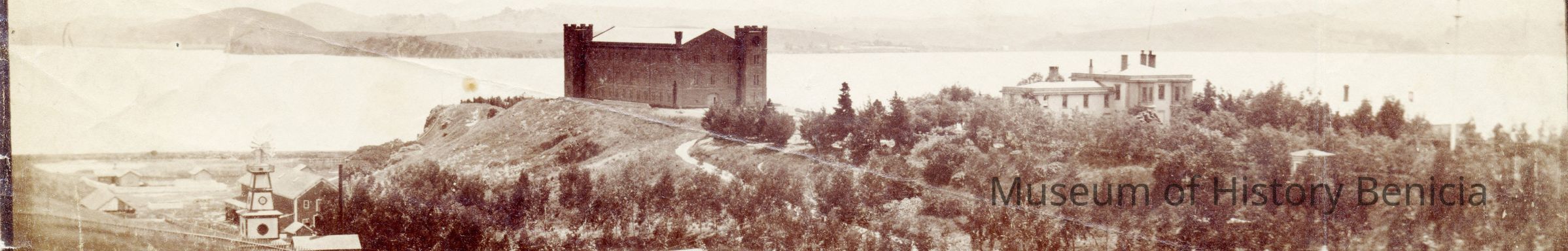 This is a photo of the Benicia Arsenal. It shows the three story Clock Tower and the Commandant's Residence. There is a windmill in the ravine below the Clock Tower and farms on the hillside. The back identifies this as the Arsenal Benicia. No date is given.Collection