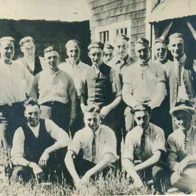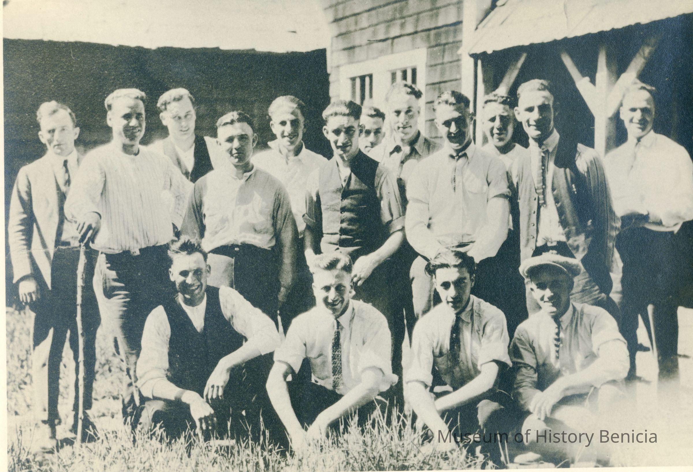 This is a photograph of a bunch of young men in the backyard of a house. The photo looks like it was taken about 1915 to 1930.
