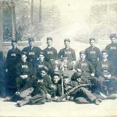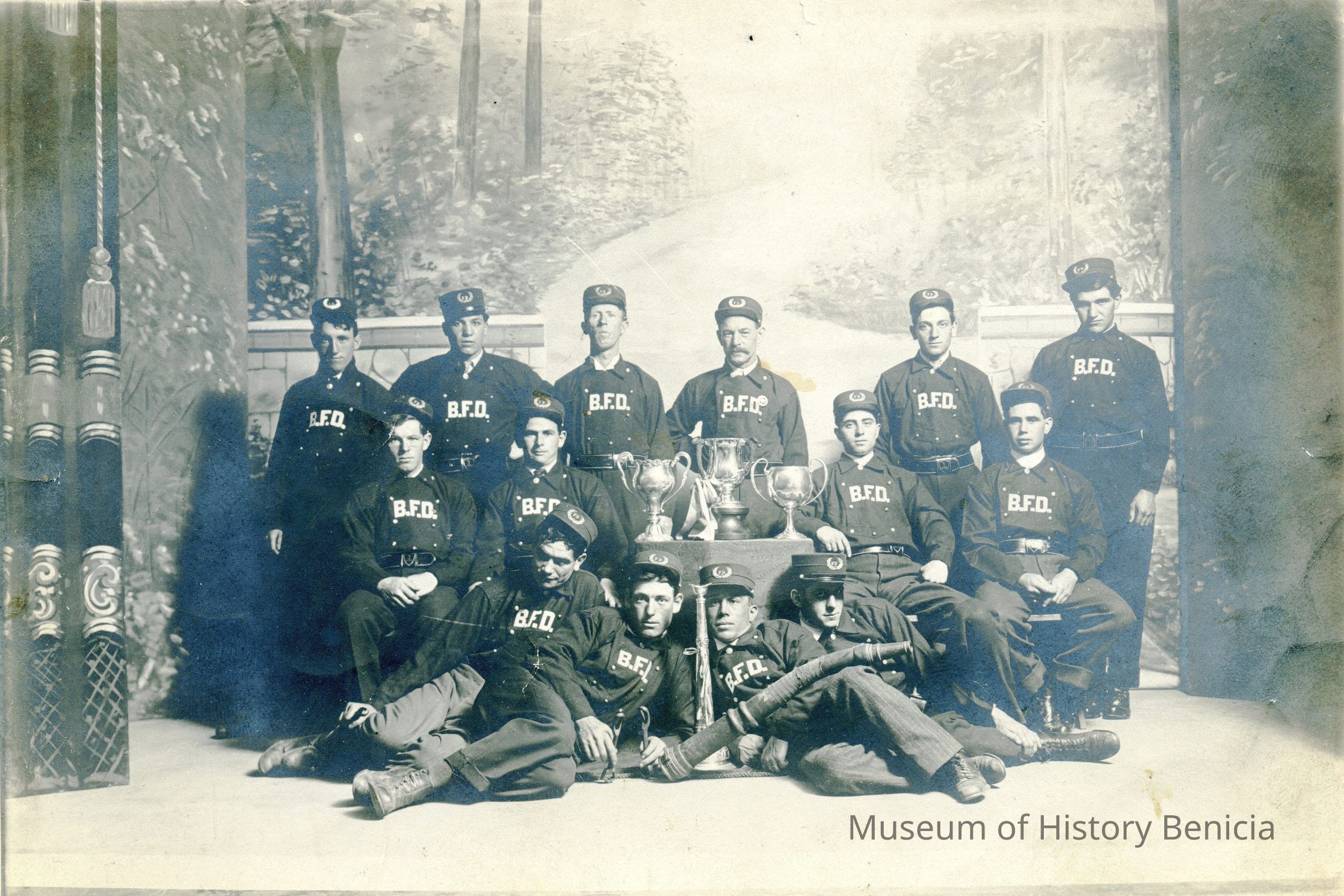 This is a photograph of members of the Benicia Fire Department taken on a stage in front of a backdrop. They are in uniform and have three trophies on a box in front and a fire hose and a megaphone on the floor next to them. The back list names of individuals followed by a number. I think this is the number of photo reprints each one wants. The names listed are: