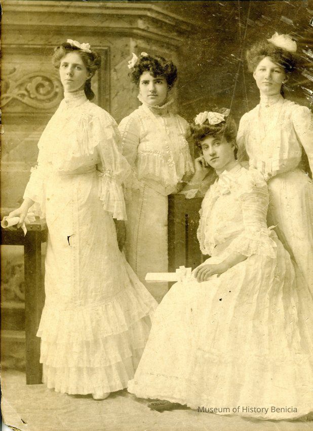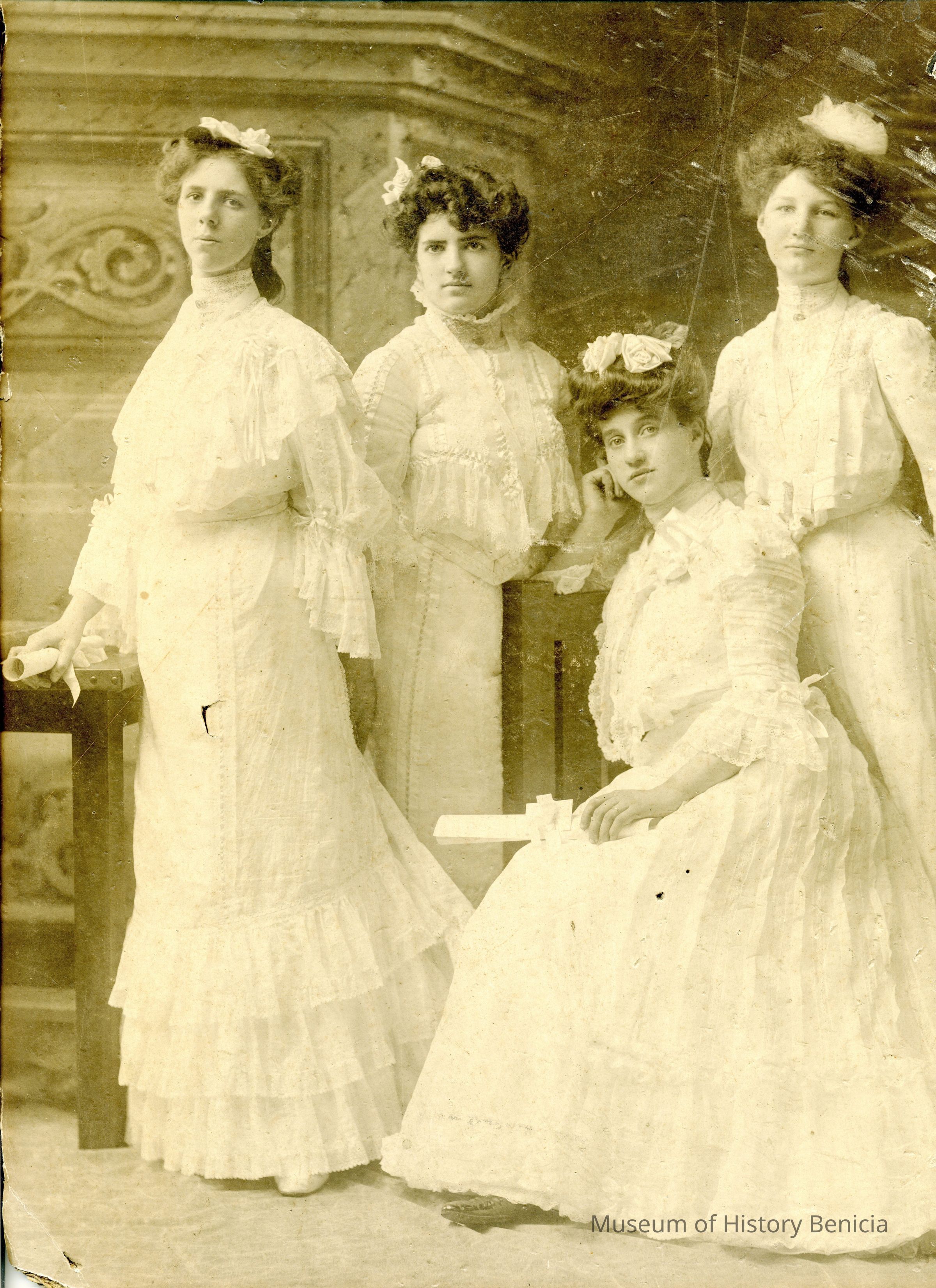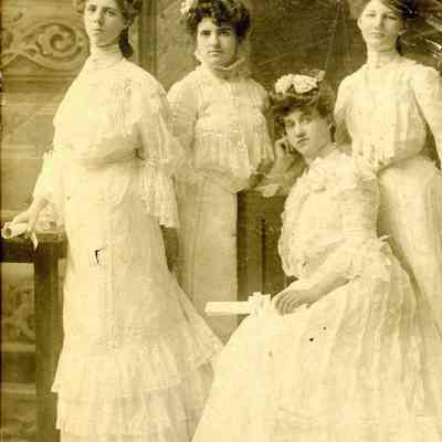This is a photograph of four young women in long white dresses. The photo was cut down from a larger photo along one side. Two of them have rolled scrolls in their hands like diplomas. This photo could be from the 1880s or 1890s.Collection
