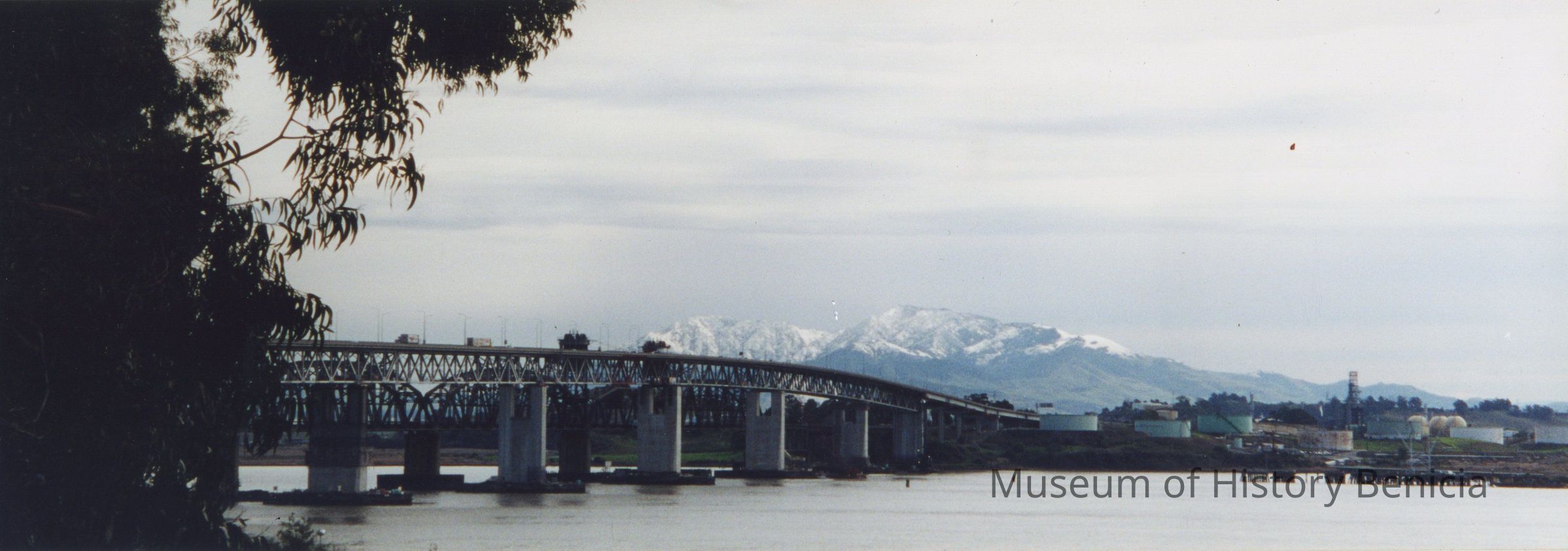 Color Photograph: Panoramic view of snow-covered Mt. Diablo; in foreground: bridges, Shell Refinery, Carquinez Strait, and at left, eucalyptus branches on western shore.Collection