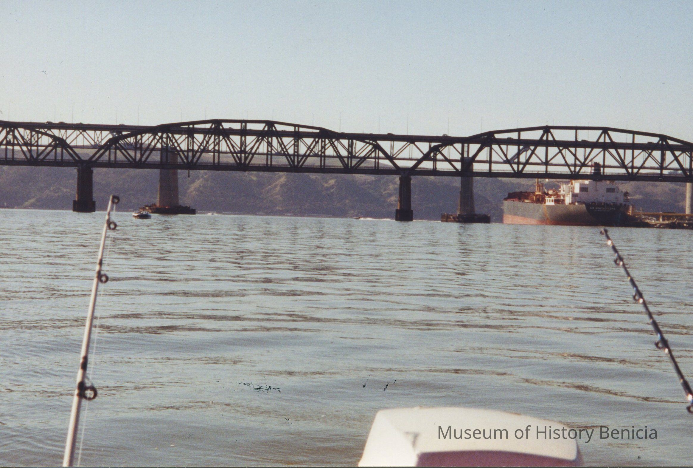 Color Photograph: Southern Pacific Rail Road Bridge in front of the Benicia-Martinez Auto Bridge; large oil tanker to the right; fishing oles in foregroundCollection
