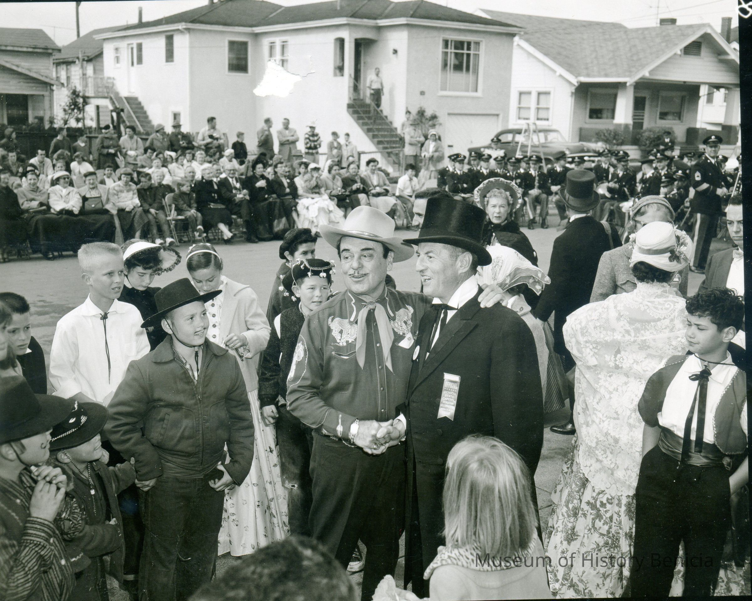 This is a photograph of the celebration of the restoration of the old State Capitol in Benicia in 1958. Shown in the photo is Leo Carrillo (actor and relative of General Vallejo) with Ed Koenig, the mayor of Benicia and other Benicians in period costume. The back says "property of Ed Koenig (former mayor of Benicia).Collection