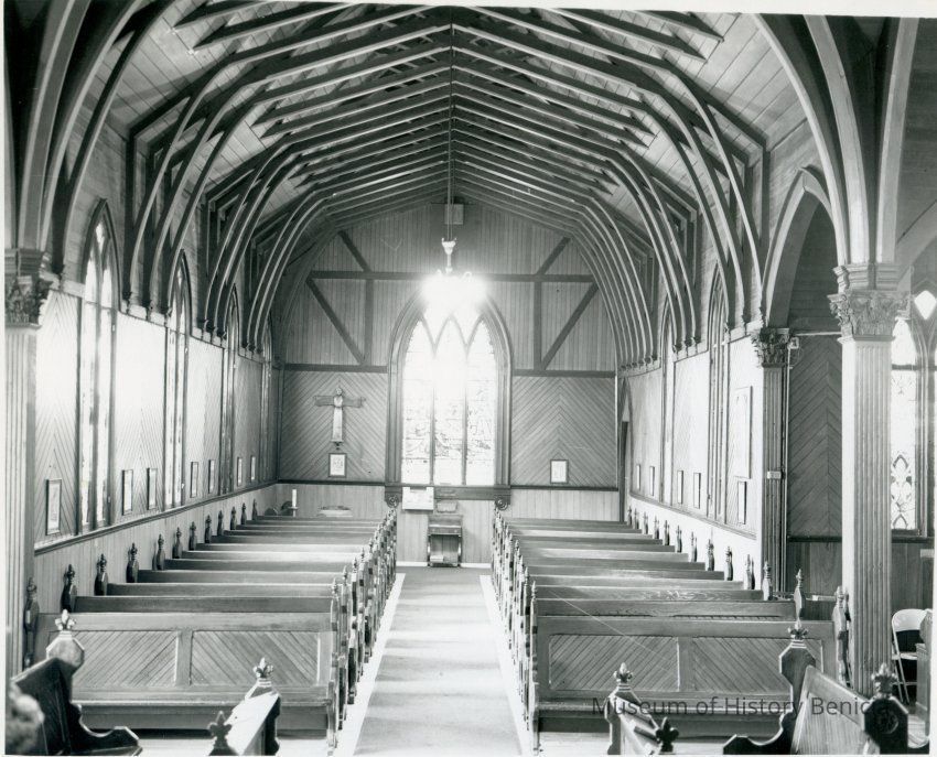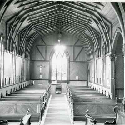 This is a photo of the interior of St Paul's church. It was taken by Dr. Dublin, date unknown). This photo shows the pews and the stained glass window.Collection