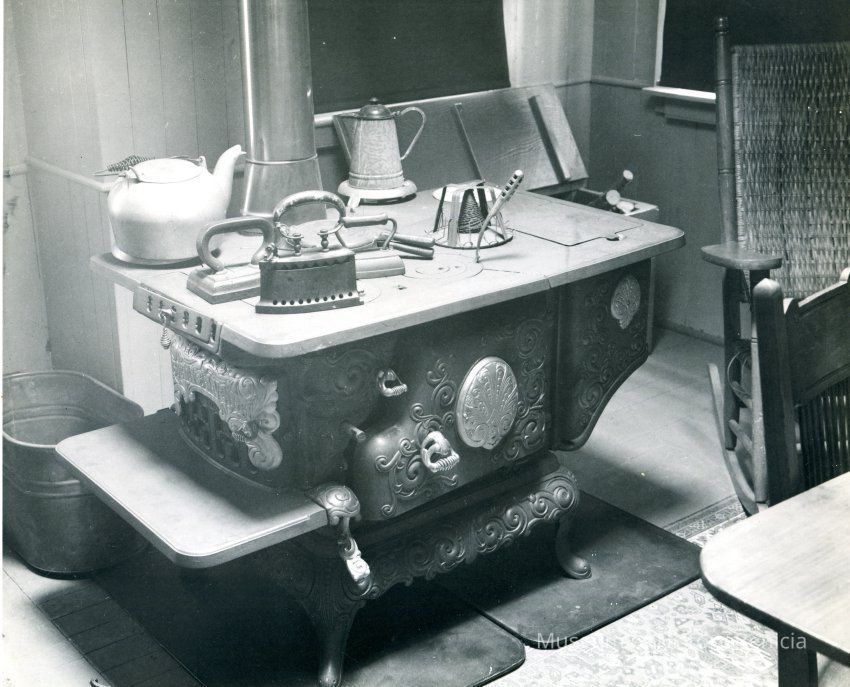 This is a photo of the kitchen in the Fischer-Hanlon house. It shows the stove, some irons and a table.Collection