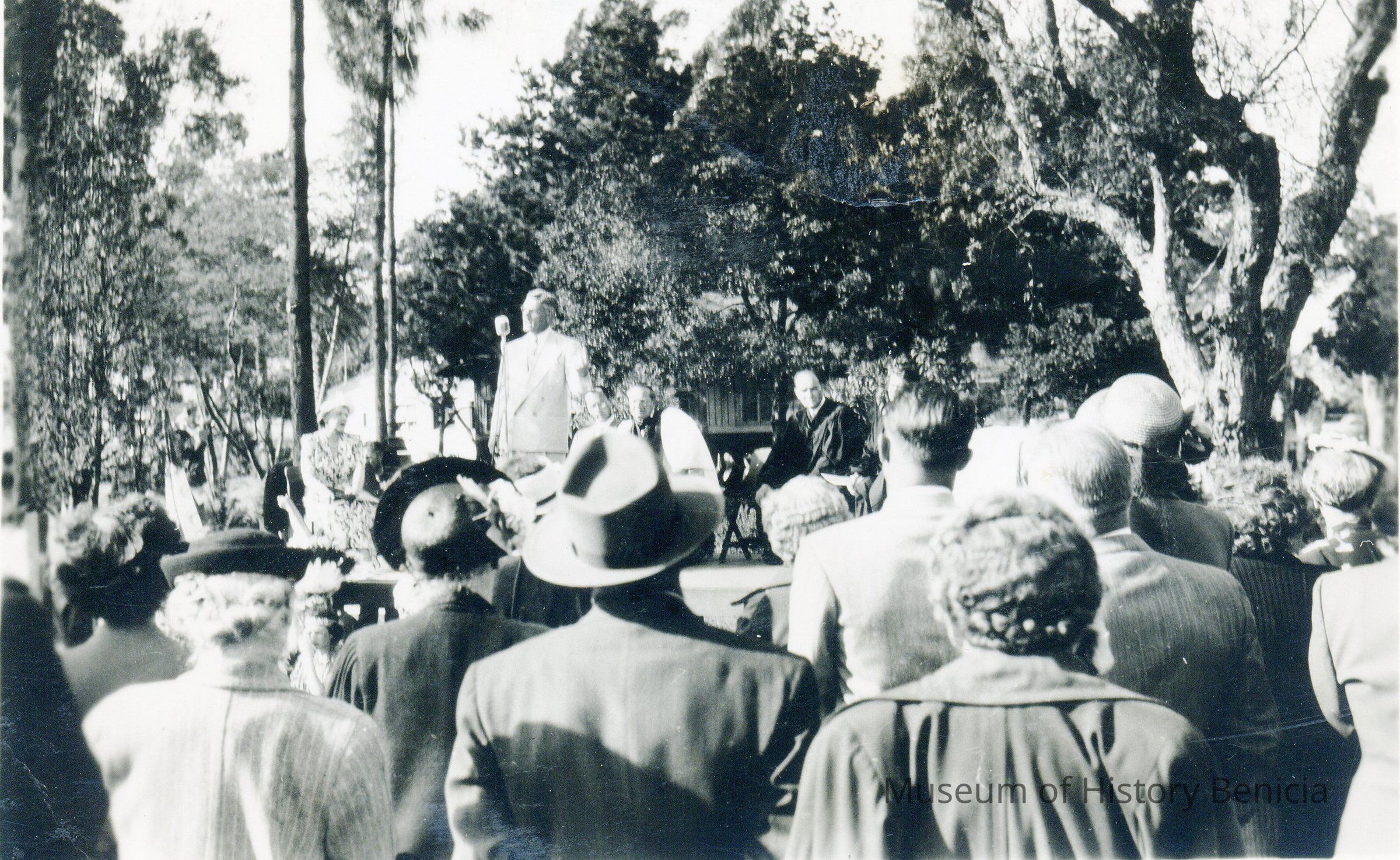 This is a photo of a meeting in the park. The crowd seems to be listening to a priest.