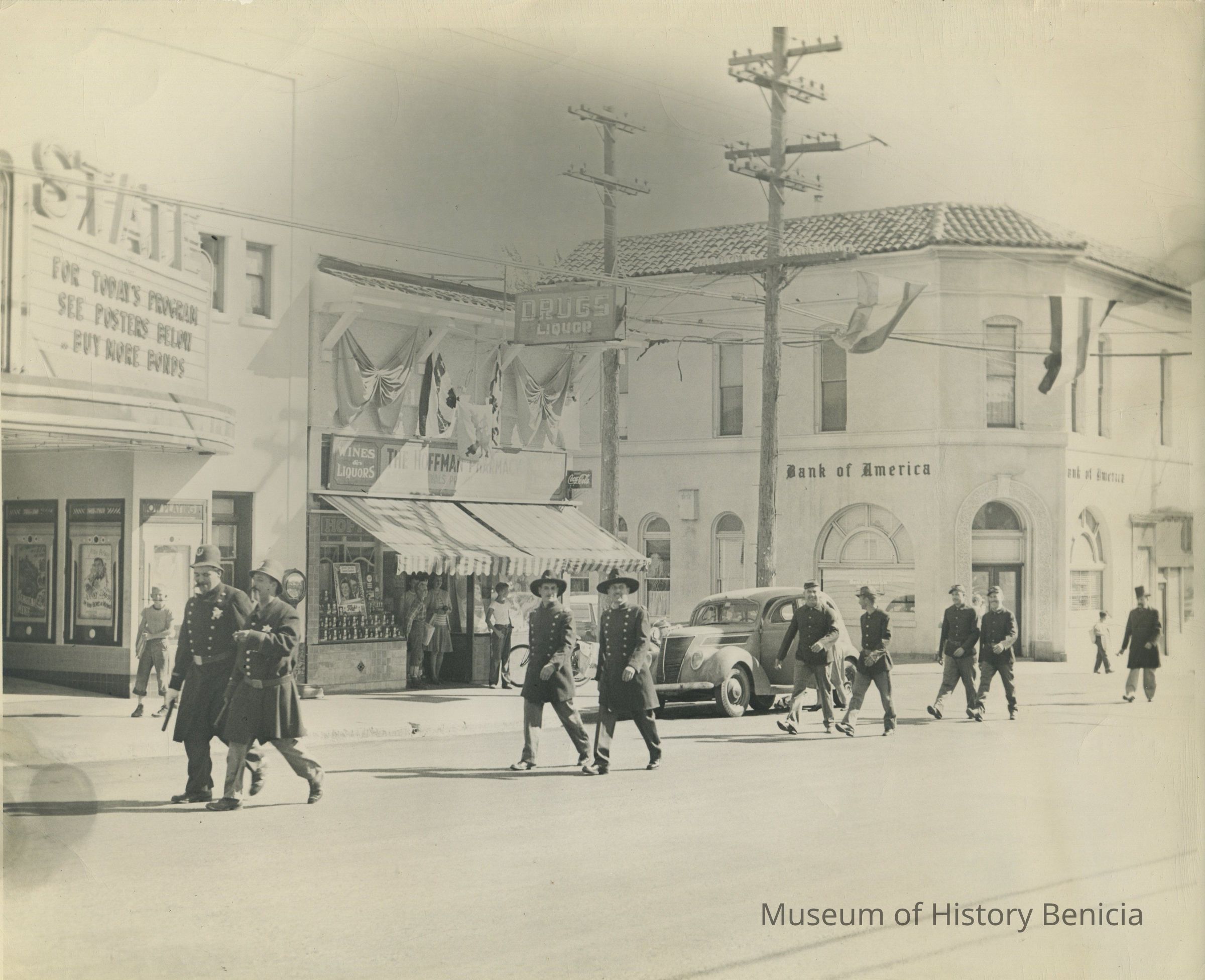 B/W photograph - men dressed in old police and military uniforms marching in a parade on First Street in Benicia. [State Theater, Hoffman Pharmacy and Bank of America are in the background.]