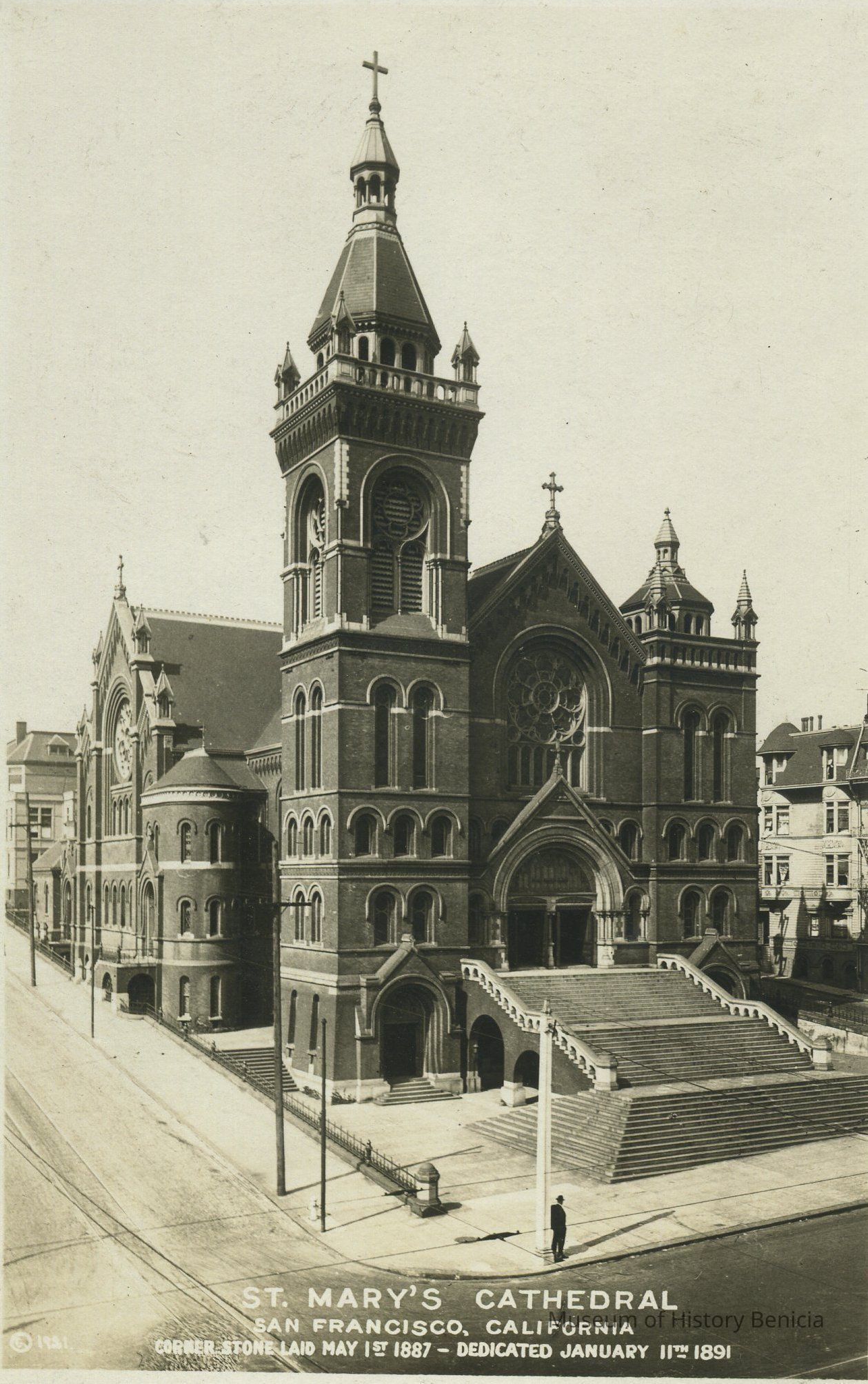 B/W photograph on cardstock - "St. Mary's Cathedral - San Francisco California - Cornerstone laid May 1st 1887 - Dedicated January 11th 1891".Collection