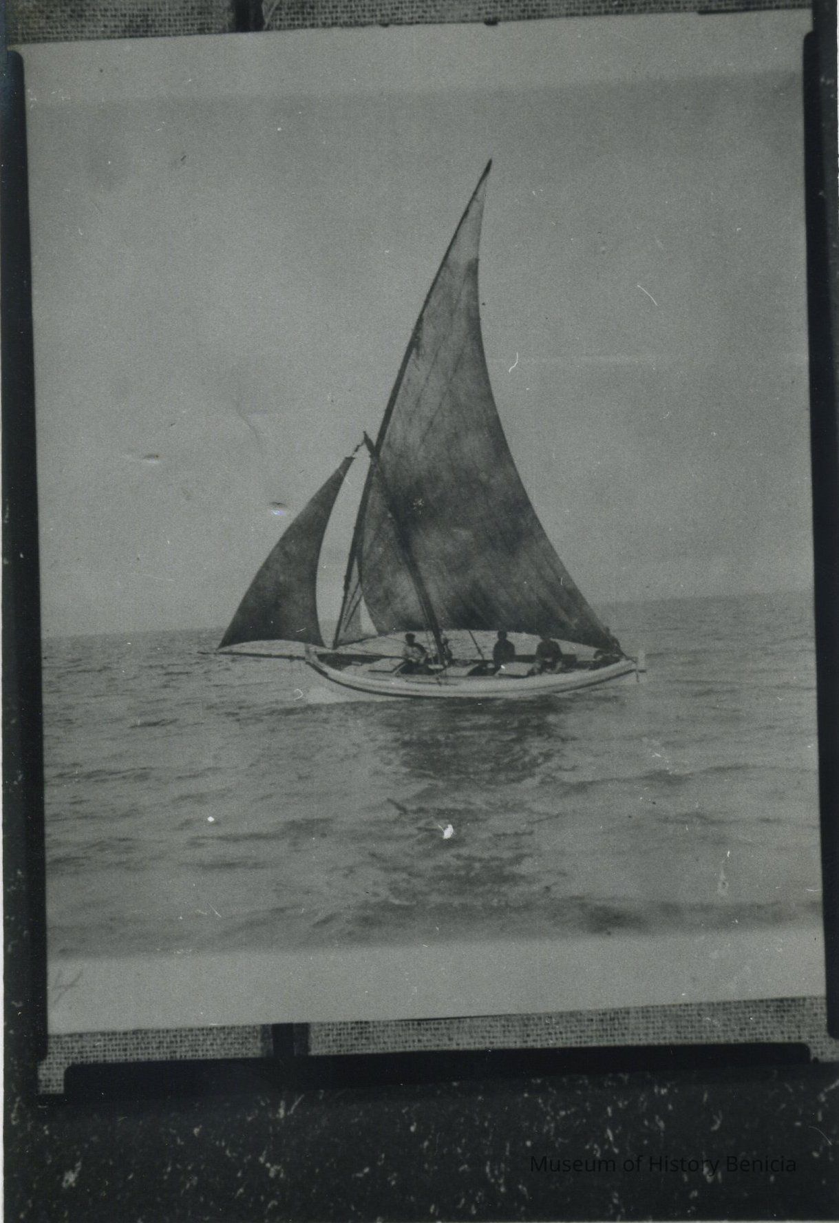 B/W photograph of a photograph: Early type of commercial fishing boat, Mediterranean-type.