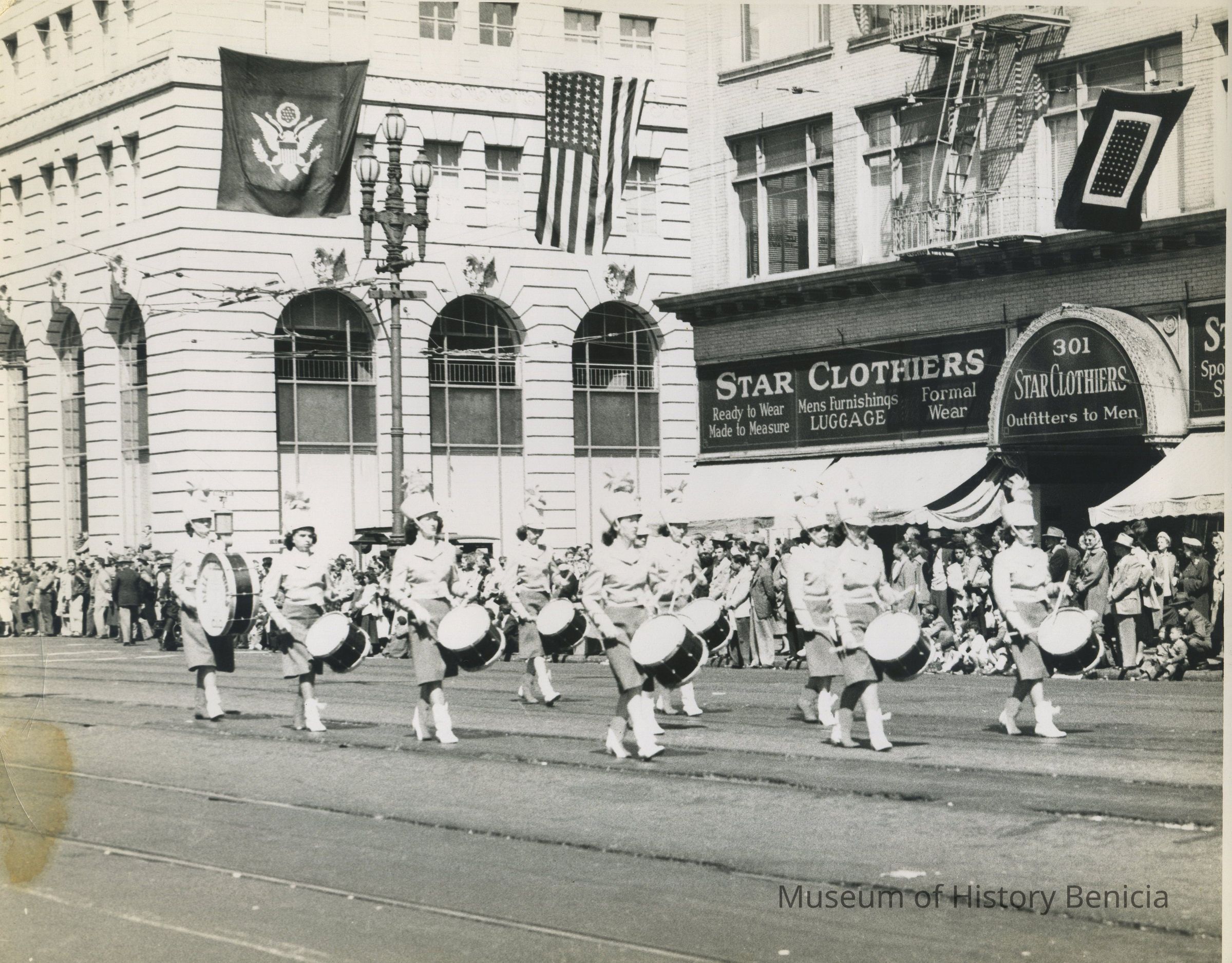 B/W photograh of a women's marching drum corps in a parade in a large city (not Benicia but perhaps San Francisco).