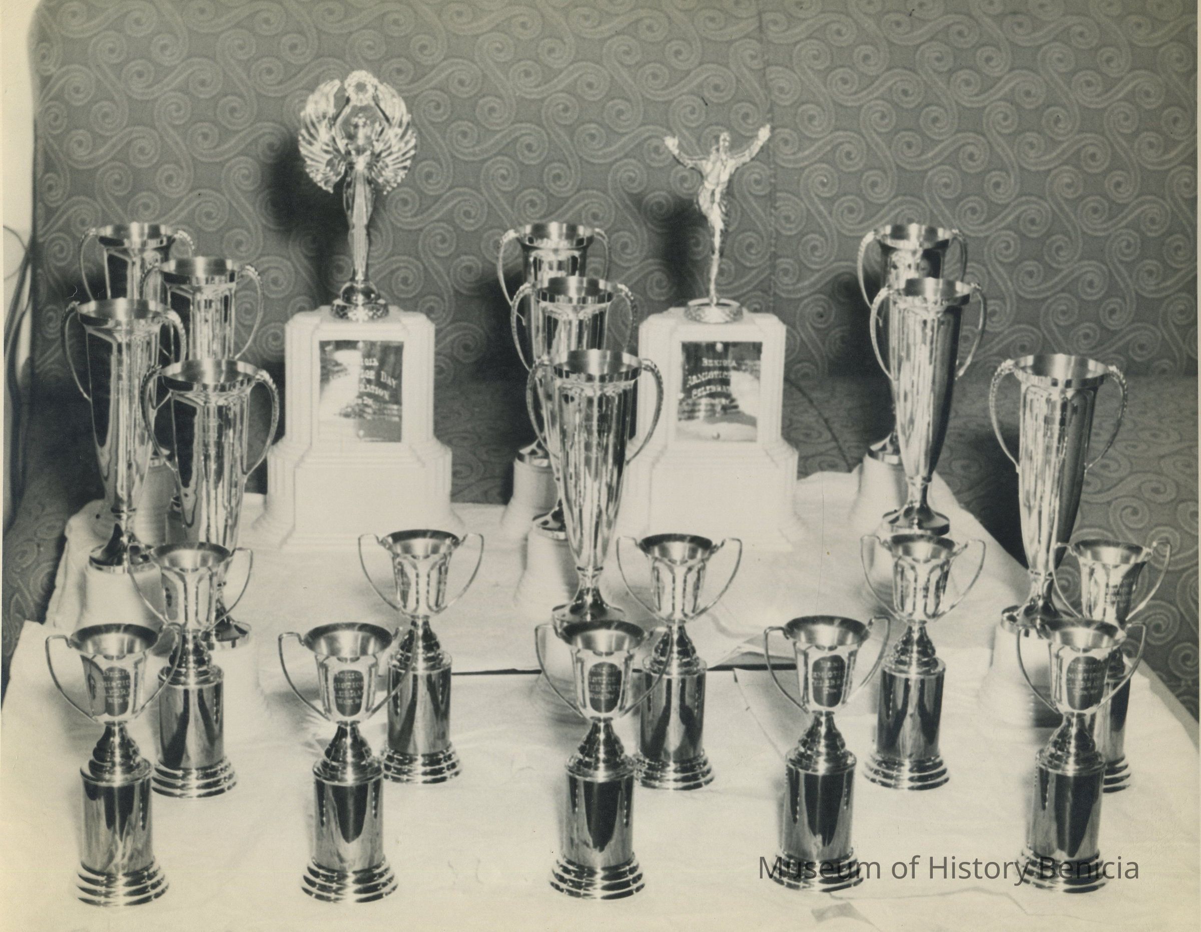 B/W photograph of two large trophies and twenty cup-style awards from some type of celebration in Benicia.
