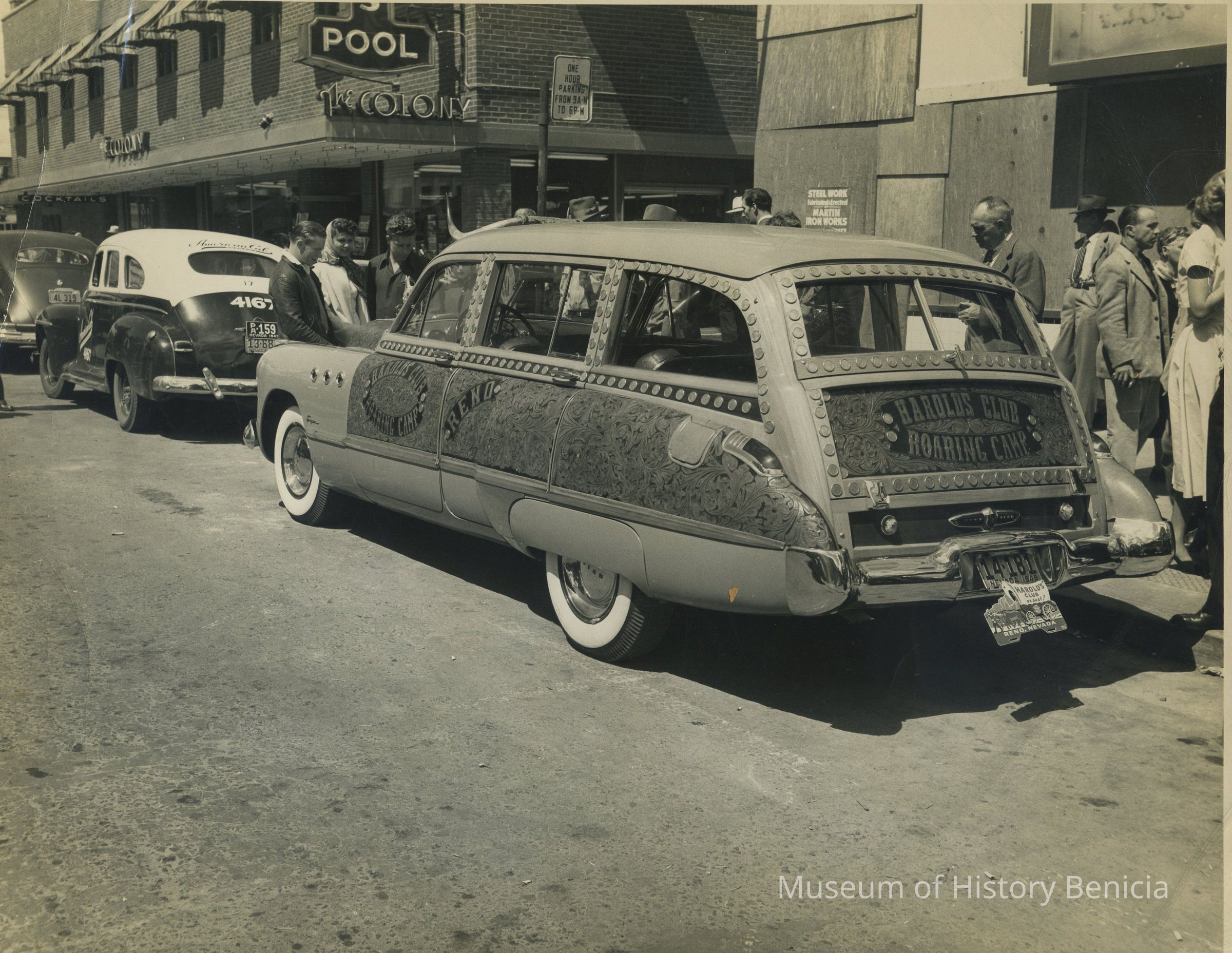 "Buick station wagon, part of Harrold's Club entry, from Reno Nevada, which will be in Benicia's 49er parade Saturday evening. Parade starts at 7 pm. The station wagon is made of hand tooled leather and there are 682 silver dollars mounted on it. A silver horse is mounted on the hood and steer horns adorn the top."
