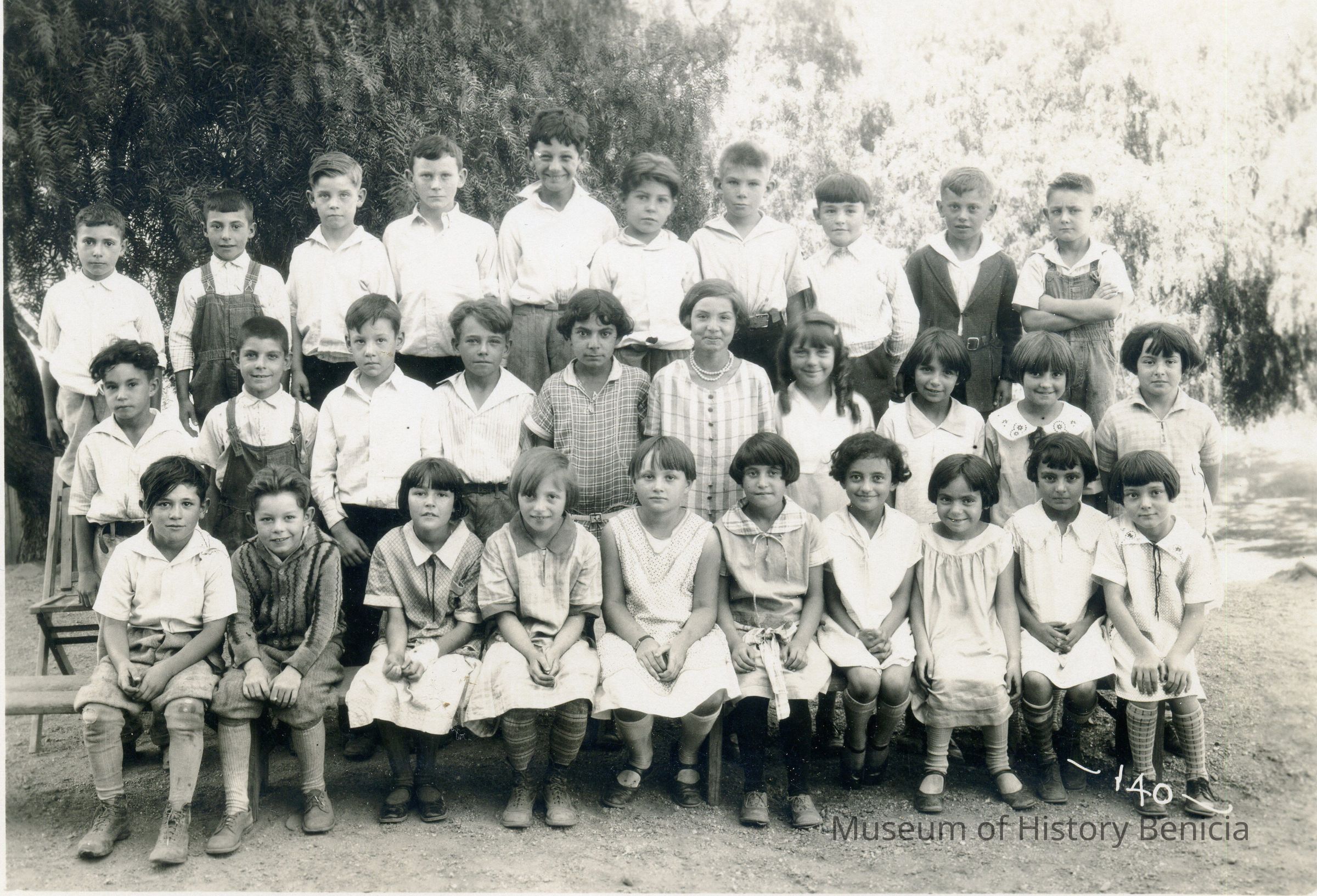 Benicia class photo taken in City Park in 1927-1928. The photo has a list of the students in the photo. The names are: