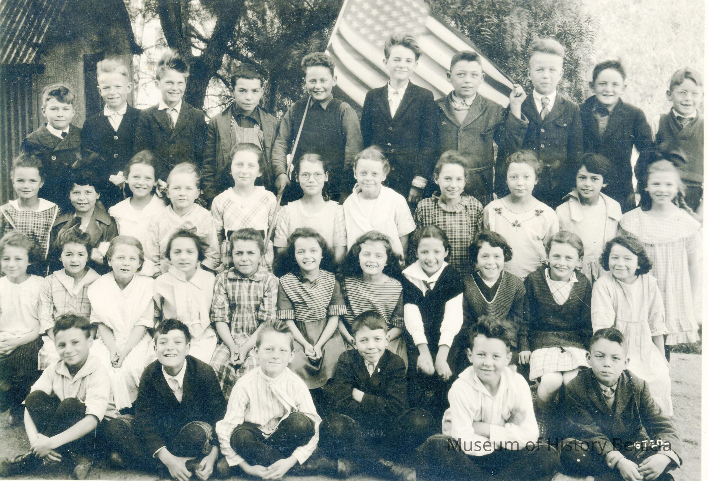 Benicia class photo taken in City Park . There are no names listed on the back. There is a 48 star flag in the photo which limits this photo to 1912 to 1959. Probably in the 1930s.Collection