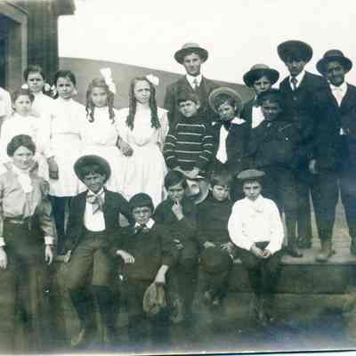 This is a photograph of Sulfur Springs school about 1908/1909. It is of a party for the last day of school. Miss Vera Parker was the teacher.Collection