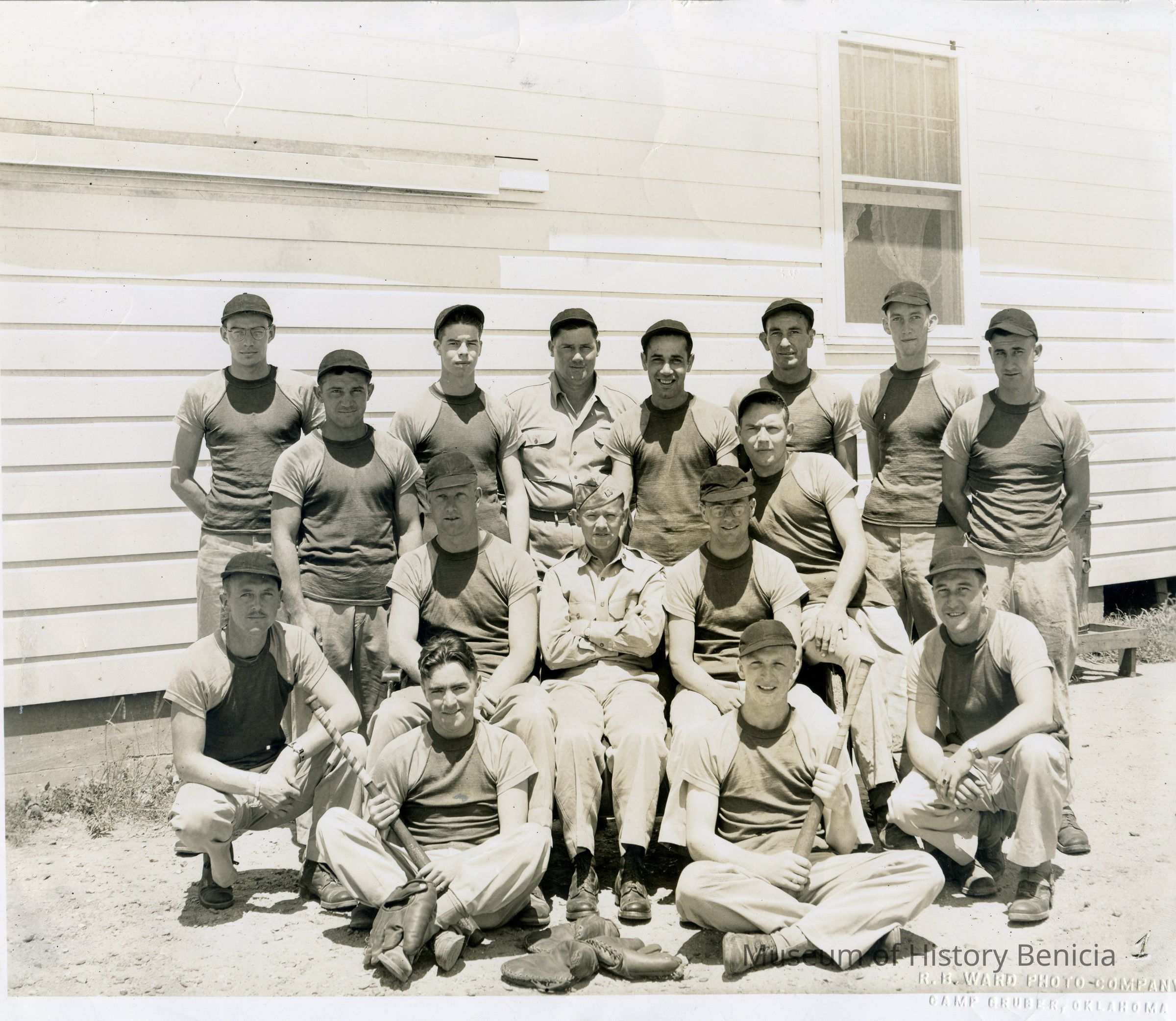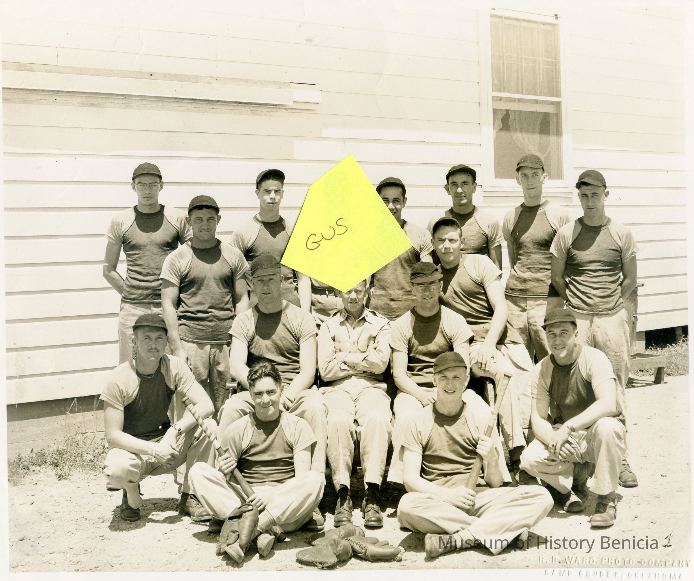 A photograph of Gus Kyriazi and a baseball team. The studio that took the photo is R.B. Ward Photo Company of Camp Gruber Oklahoma. The man in the center of the photo is in uniform so this may be when Gus was in the service.Collection