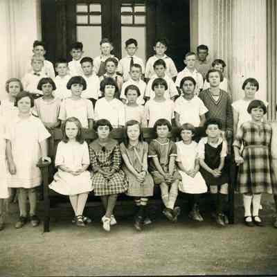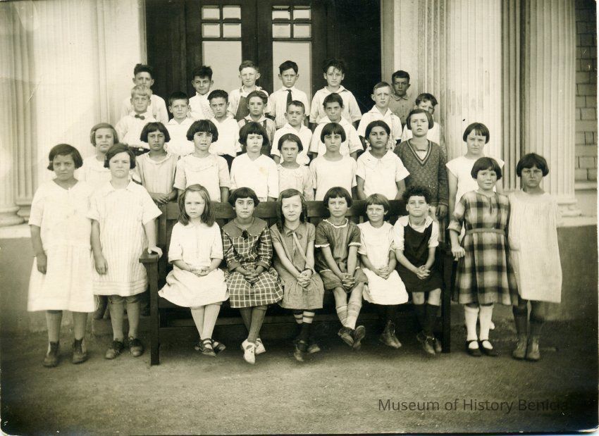 Photo of a class in Benicia taken on the steps of the old State Capitol. There are no names listed on the back. The date shown on the back is 1925-1926Collection
