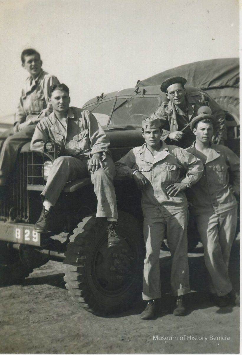 WWII soldiers sitting/leaning on a vehicle, Thomas Donohue is at top right