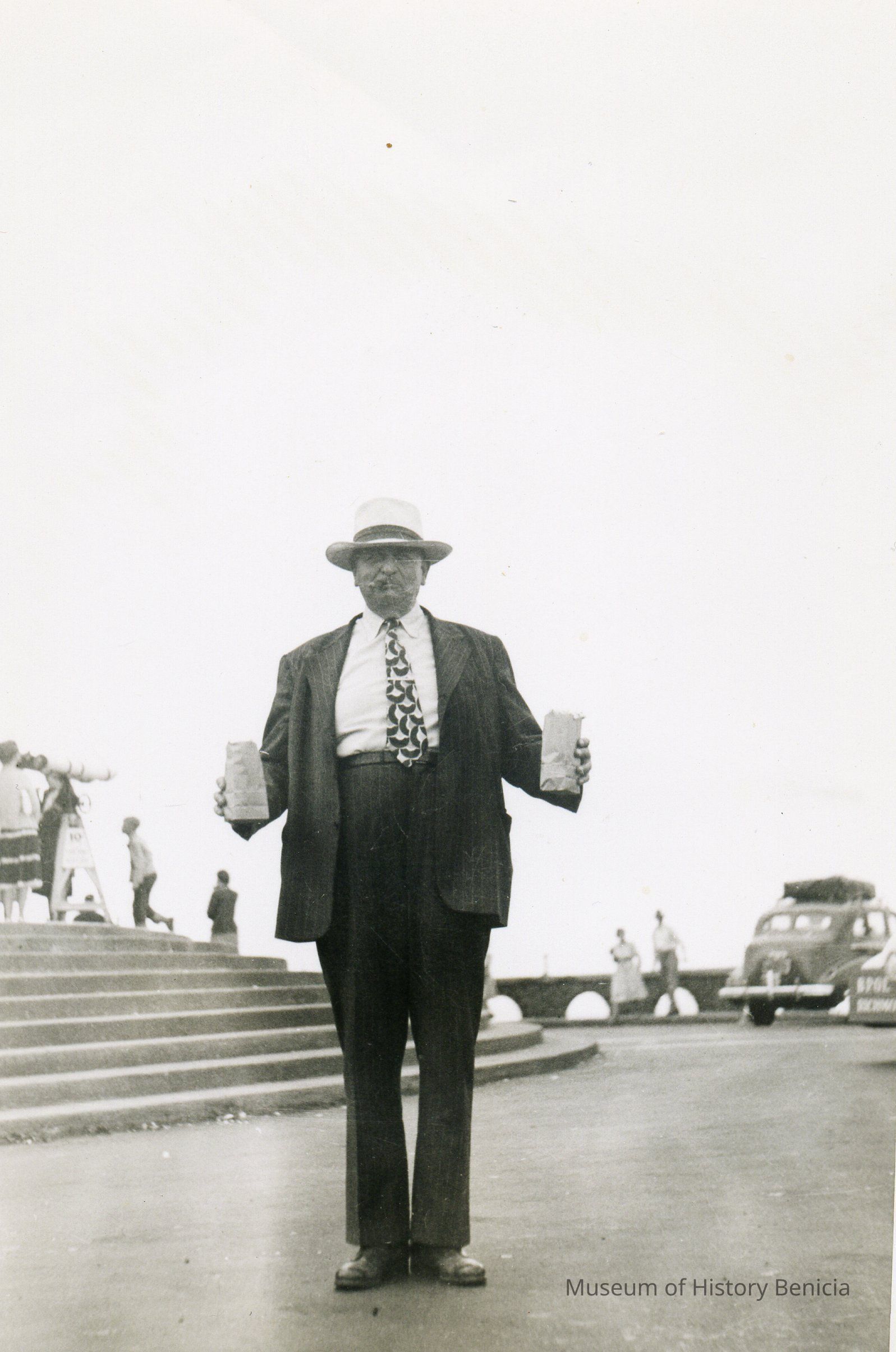 Photo of Thomas Wright in front of steps and holding two bags of popcorn. The photo has adate of 1947 on the back