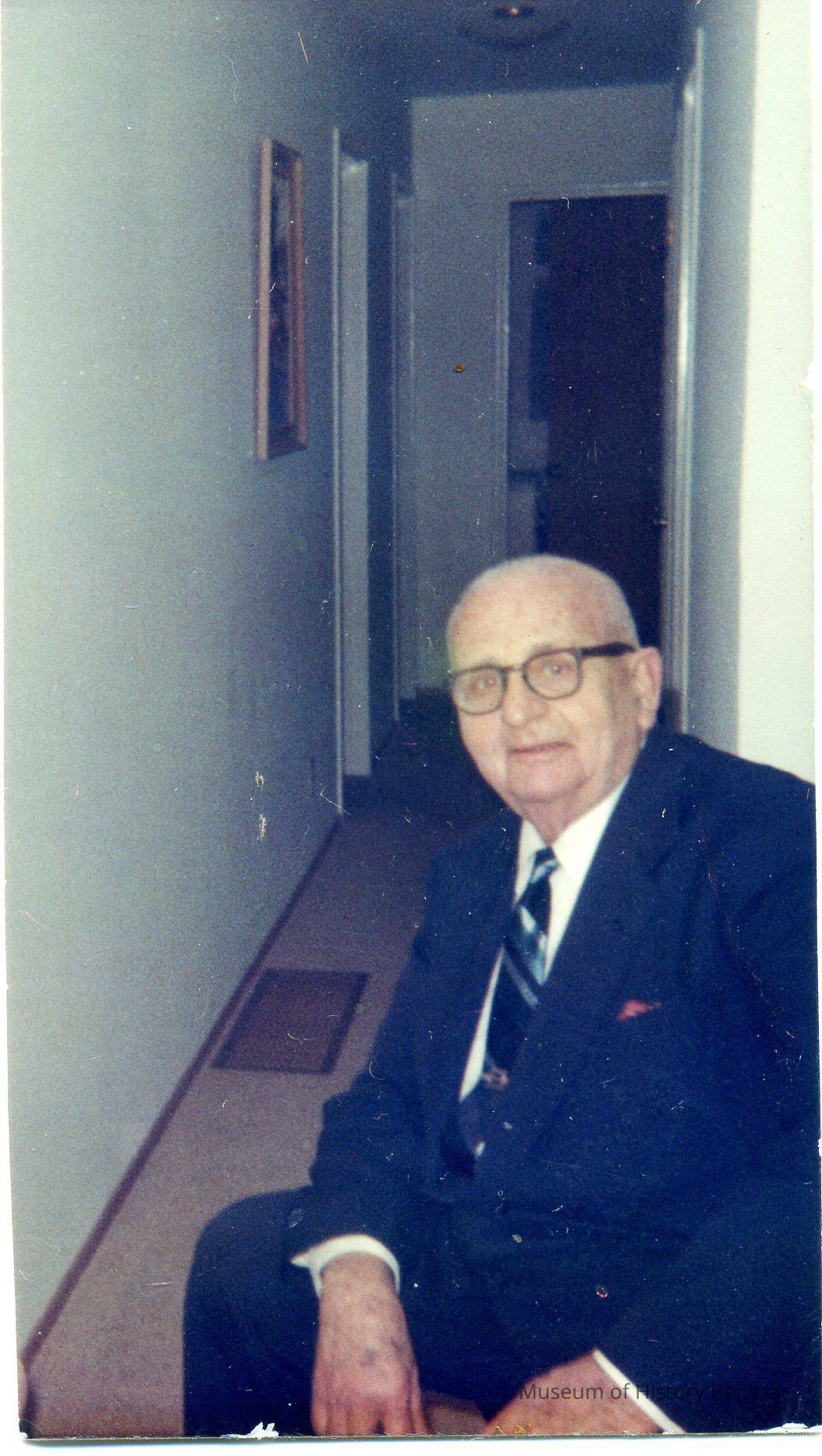 Photo of Thomas Wright sitting in a hallway. Photo has been cropped.