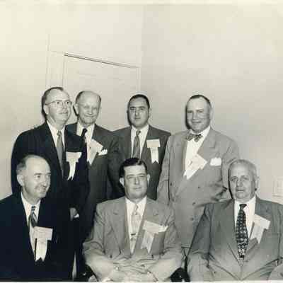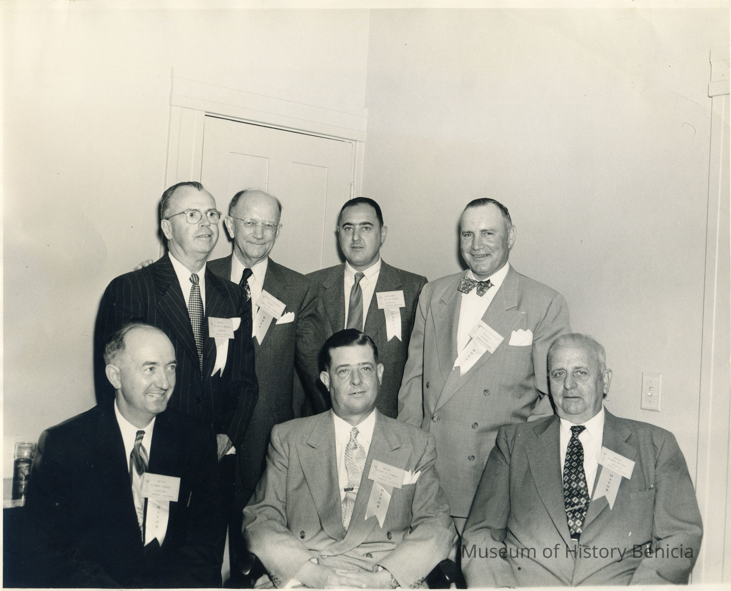 Photo of Thomas Wright and several other men all wearing ribbons. Some say "Mayor" some say "Host" and some say "guest".