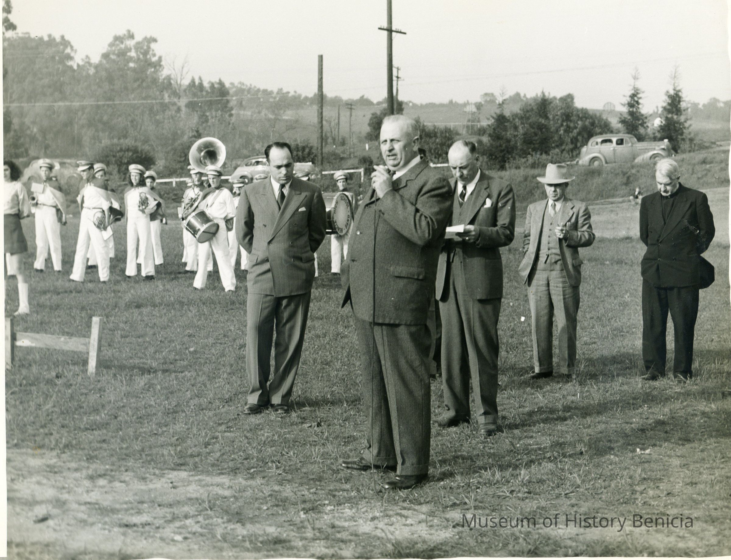 Photo of Thomas Wright talking into a mic at a formal celebration. Probably about 1945.