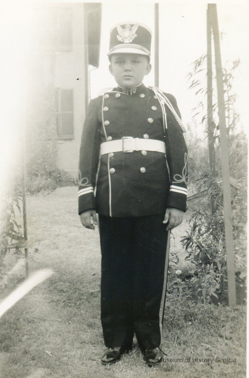 Photo of small boy wearing a uniform. The back says that it is in the "back Yard at Fort Sill in Oct 1939".