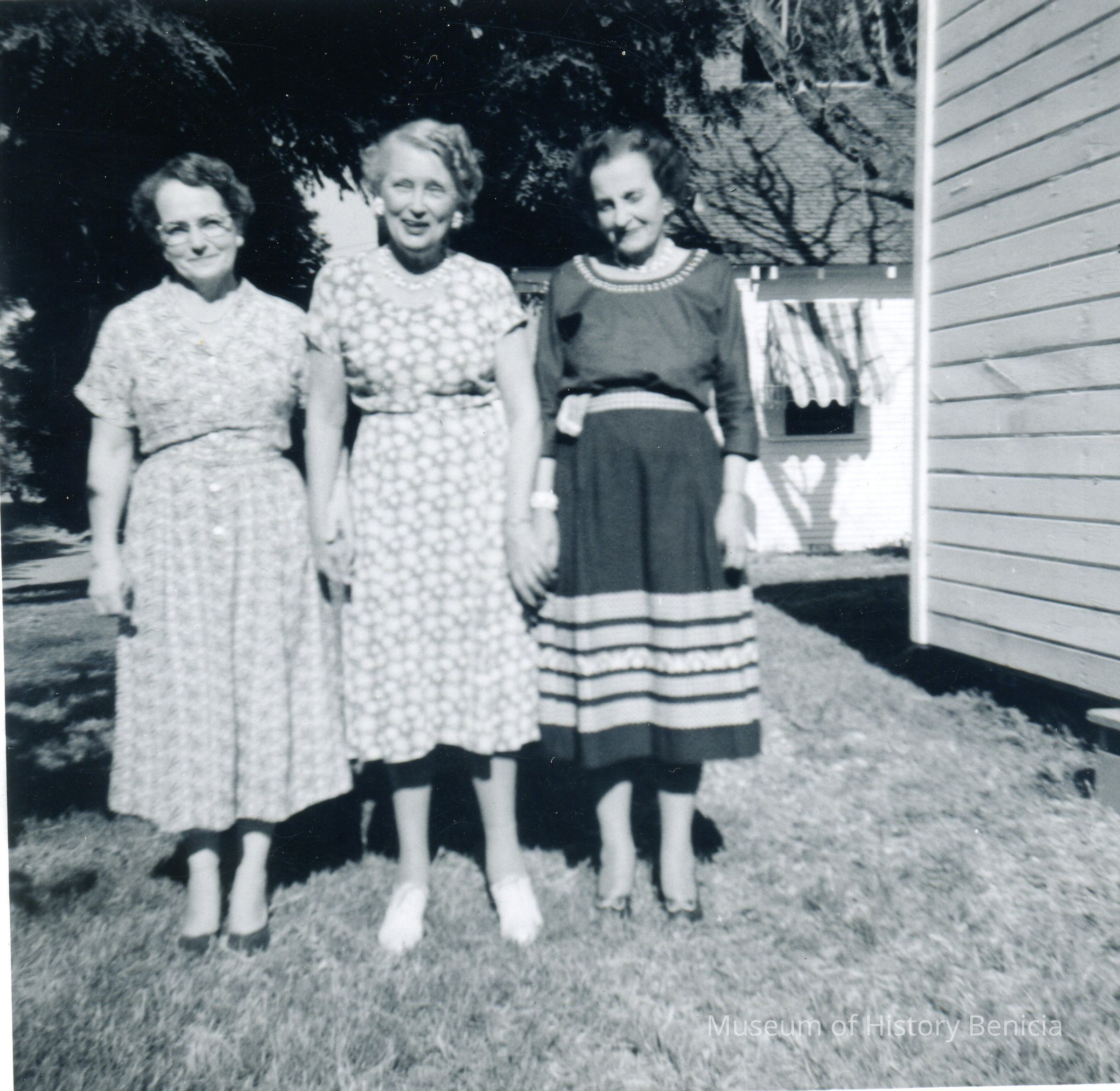 A photo of three women in front of a house.