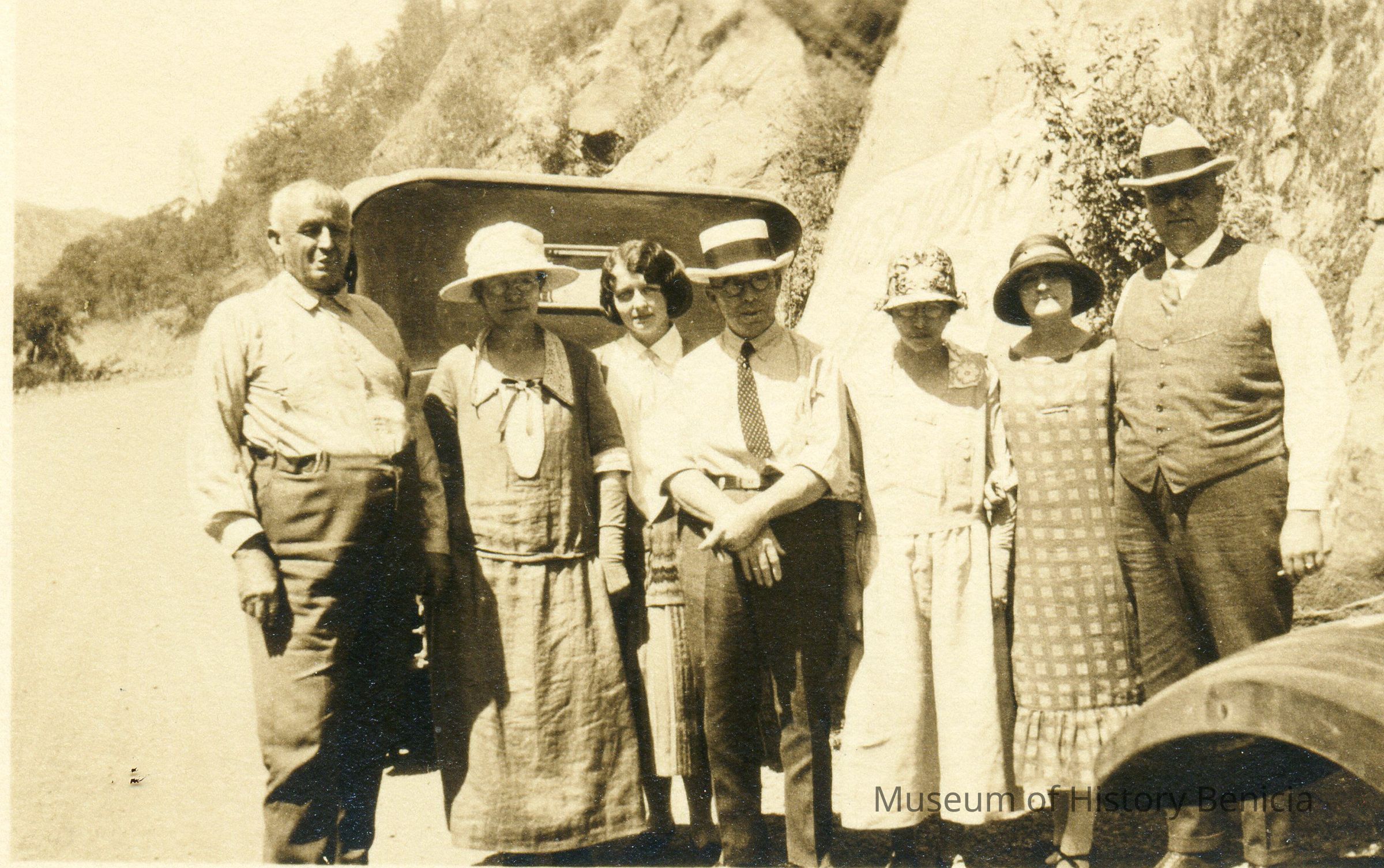 A photo of the Wrights and others on a dirt road somewhere. Date unknown. There are seven people in the photo and two old cards about 1930.Collection