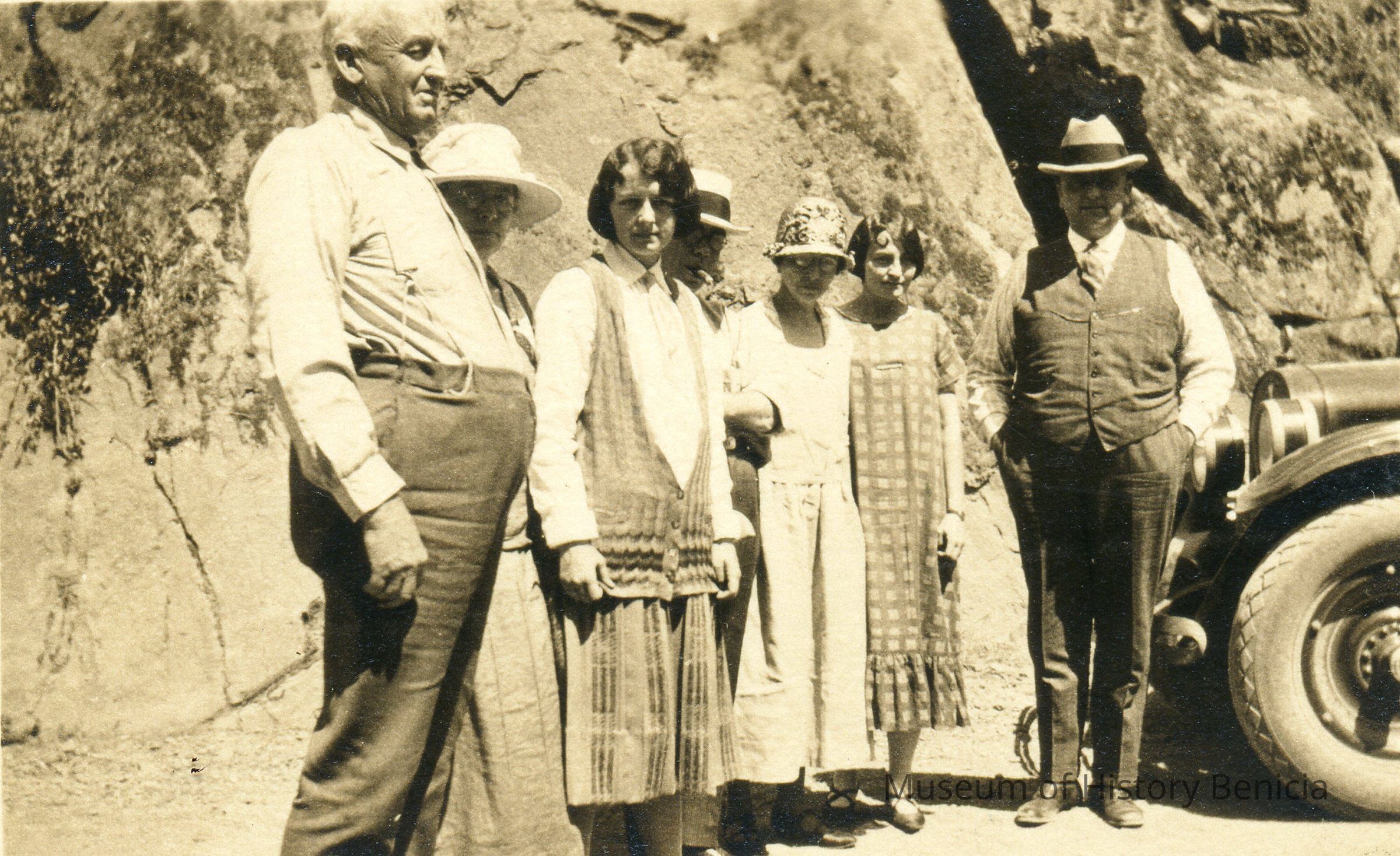 A photo of the Wrights and others on a dirt road somewhere. Date unknown. There are seven people in the photo and two old cards about 1930.Collection