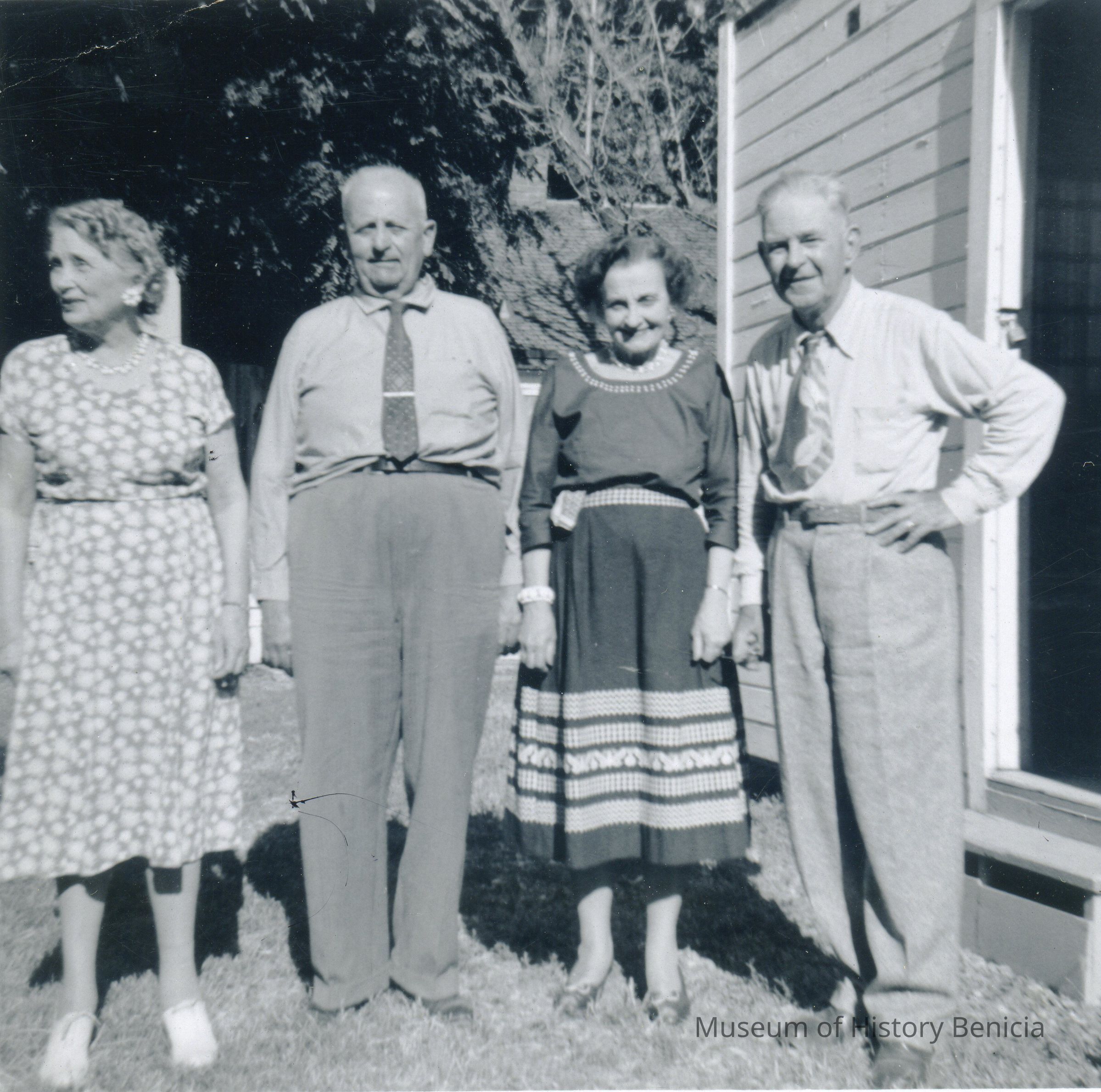 A photo of the Wrights at home in back yard. There are two other people with them.