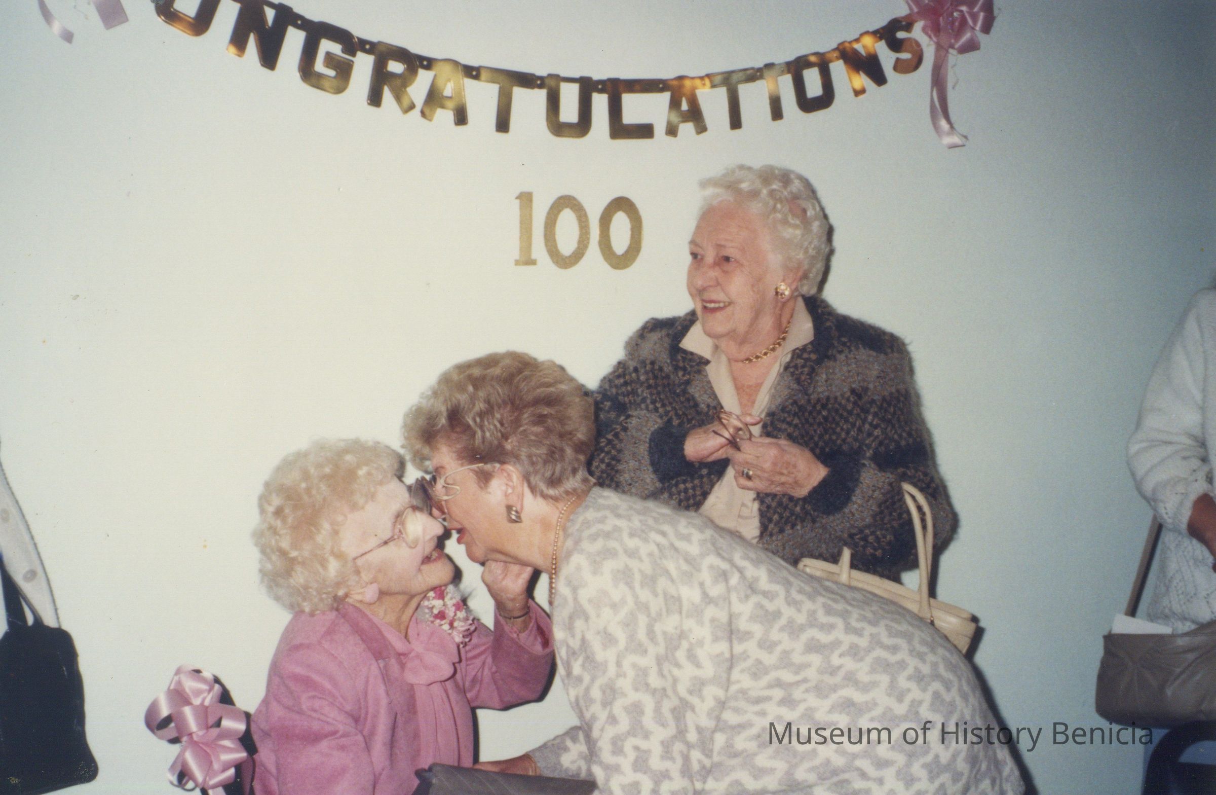 A photo of Erma Wright at her 100th birthday party at Gina's on 11/16/1991. Also in the photo isGeorgia Wagner and an unknown person.Collection