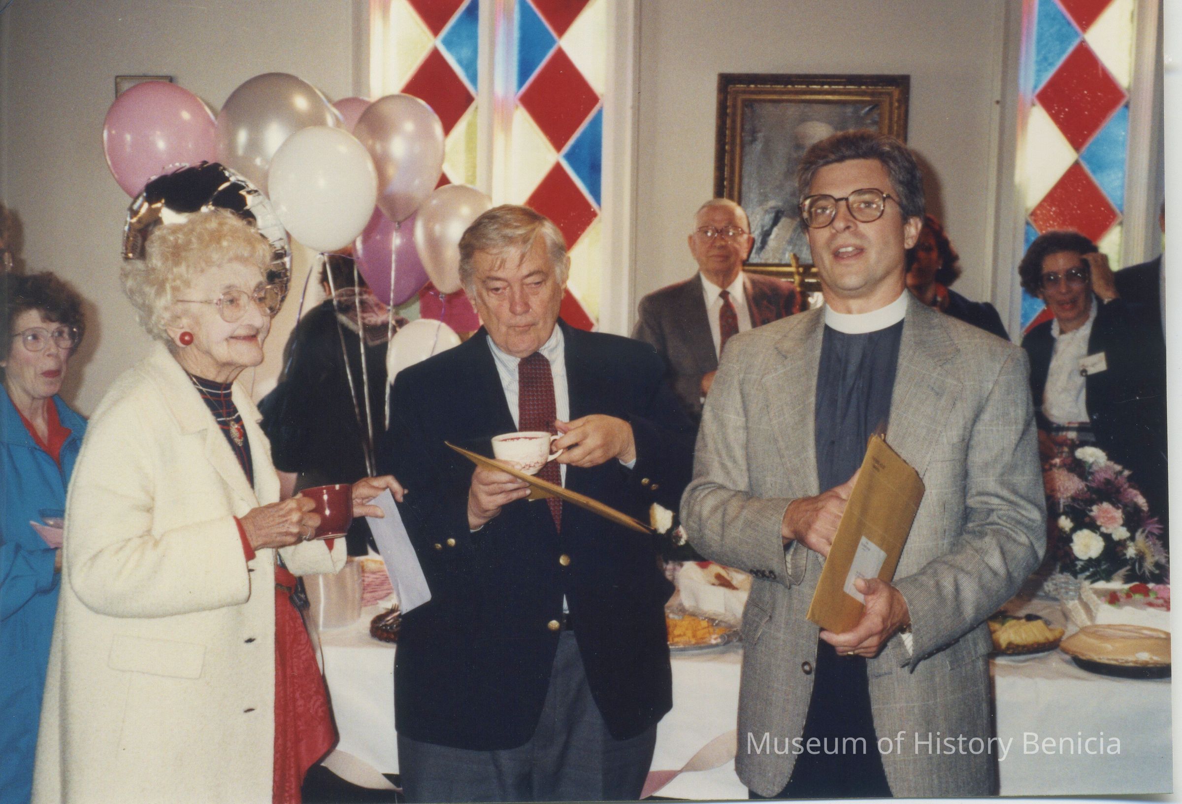 A photo of Erma Wright at her 100th birthday party at St Paul's on 11/17/1991. Also in the photo is Dudley Westerl, Father Harold Cinchear.Collection