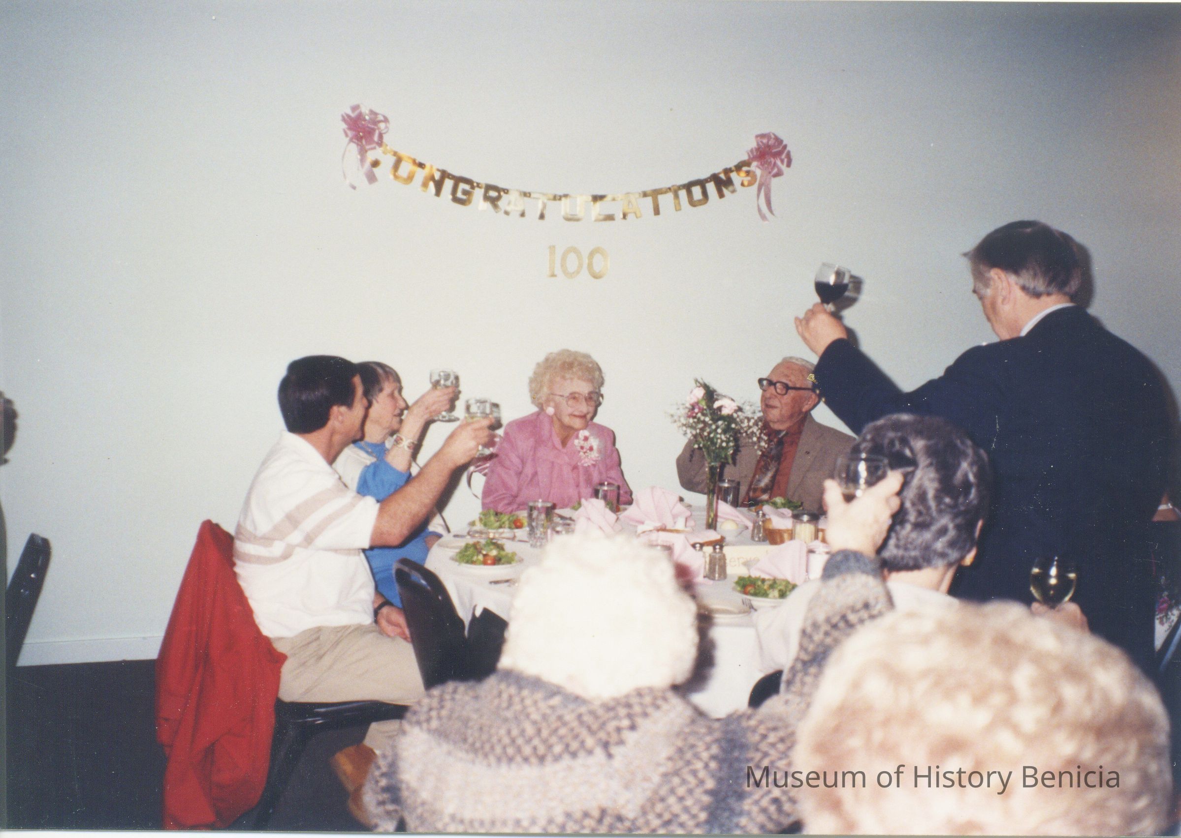 A photo taken at Erma Wright's 100th birthday party at Gina's on 11/16/1991. They are toasting Erma.