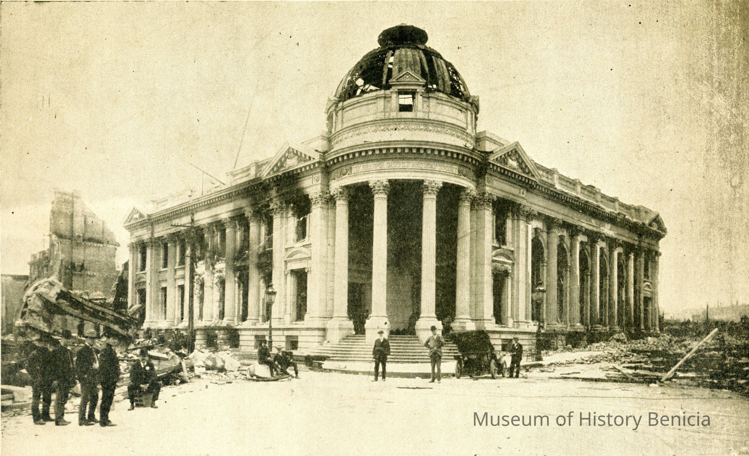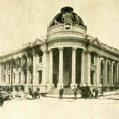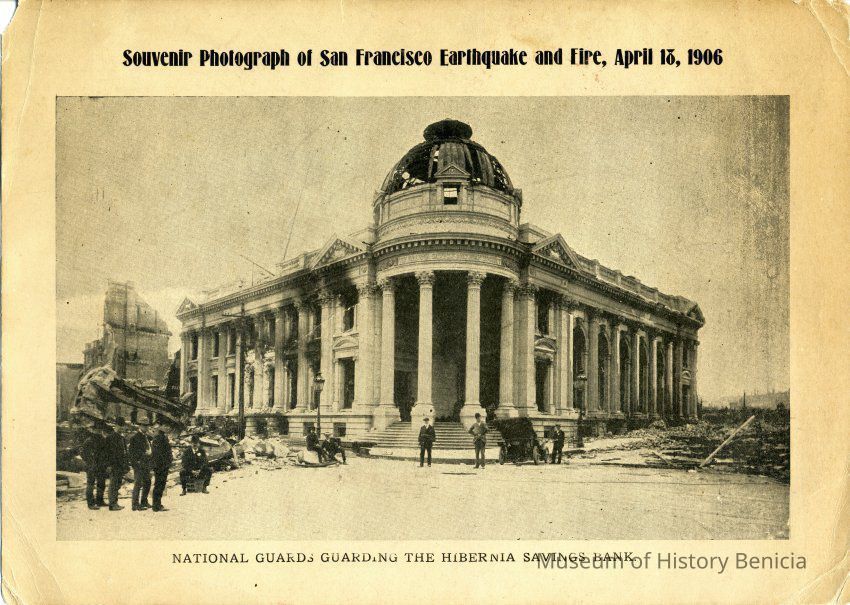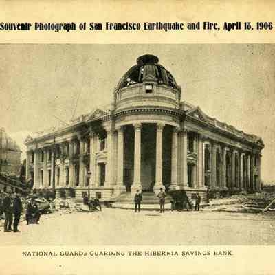 This is a photo of the Hibernia Savings Bank in San Francisco after the 1906 earthquake. It is part of a souvenir photograph showing the National Guard in front of the bank.Collection