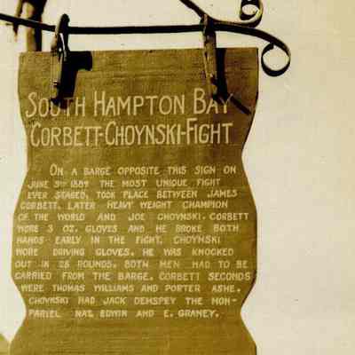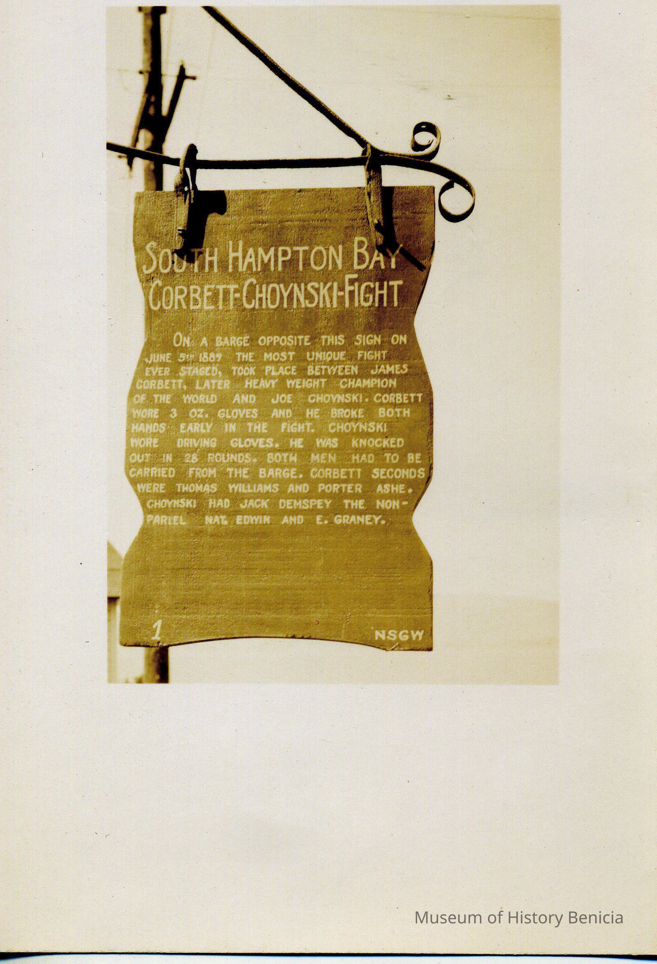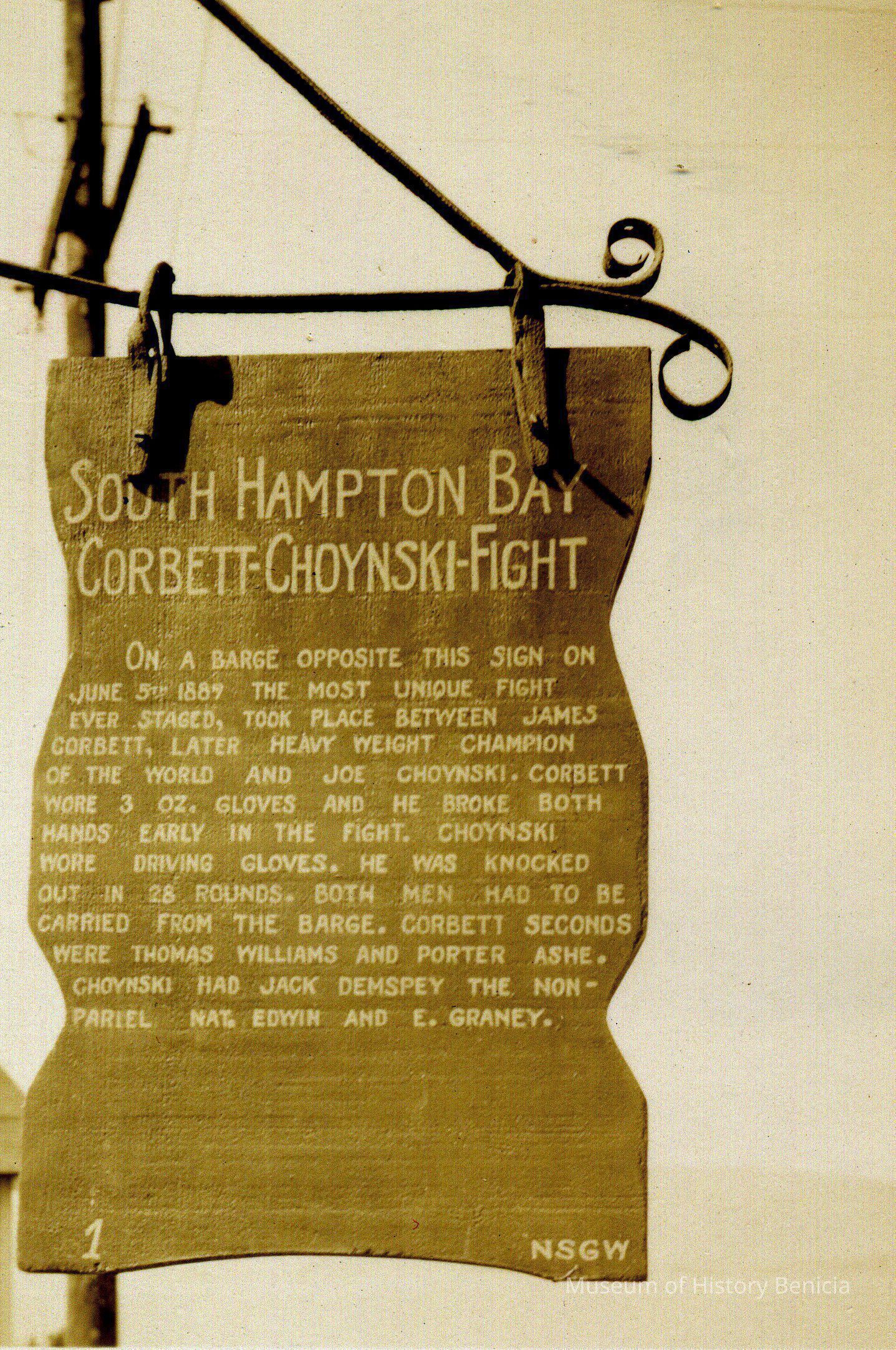 Wooden sign showing historical places and events in Benicia. This one is for the Corbett / Choynski fight held on a barge in Southampton Bay. These signs were sponsored by the Native Sons of the Golden West..Collection