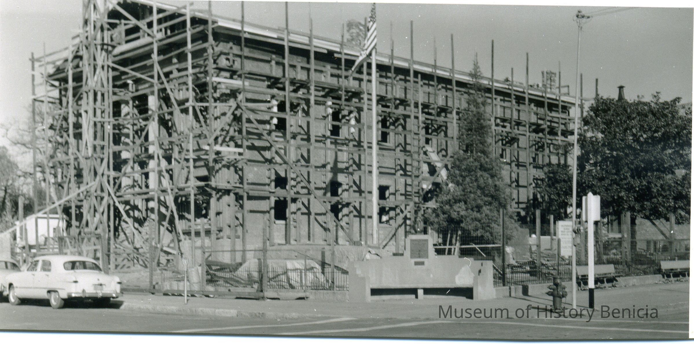 Photo of the Benicia State Capitol during restoration. The bottom edge has been cut off.