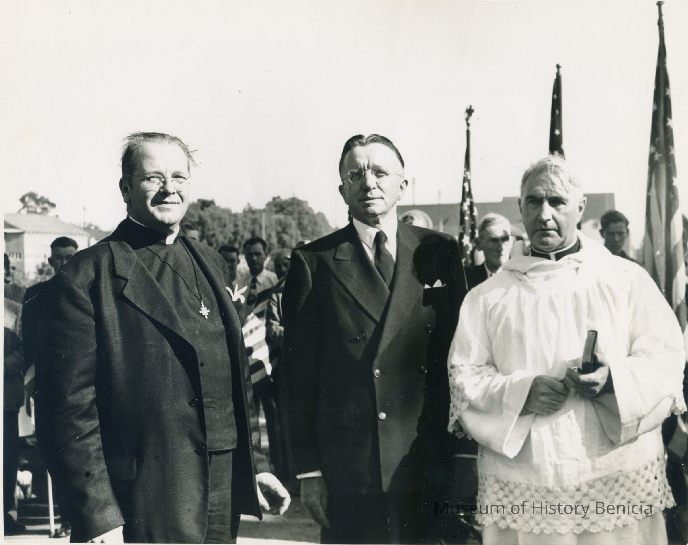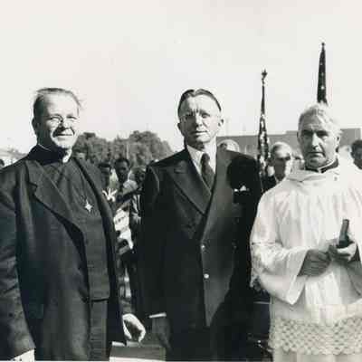 Photo of three men in front of a crowd some of whom are carrying flags. The men appear to be religious leaders but not sure of the reason for the gathering.Collection