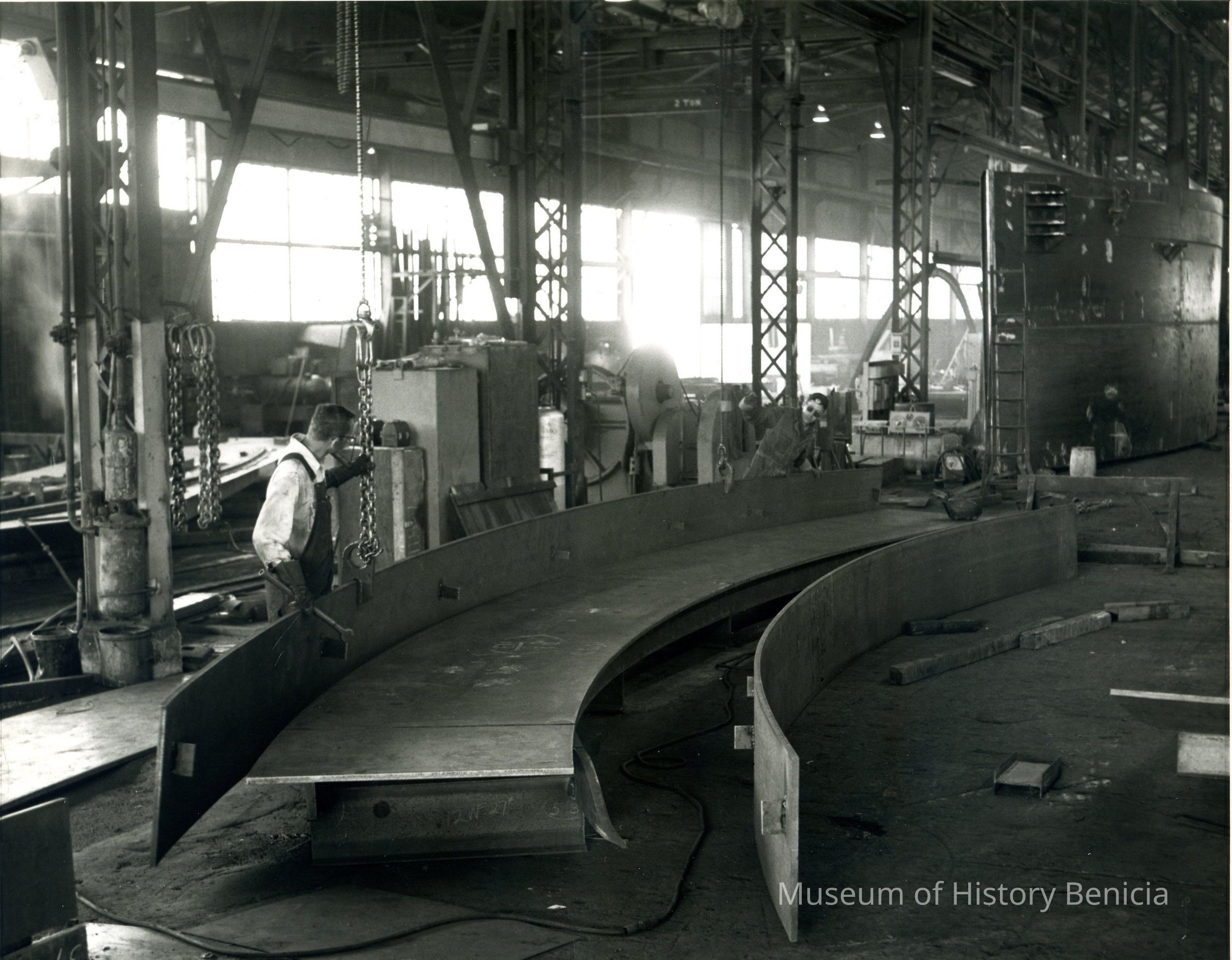 8"x10" B/W Photograph - Yuba Manufacturing Two unidentified men are working with a large piece of curved metal; on back: #1-8-26-58