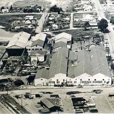 Top: Aerial view of the Yuba Manufacturing Plan; East H is to the right, running bottom to top of the photo; East 8th runs left to right at the bottom of the photo;