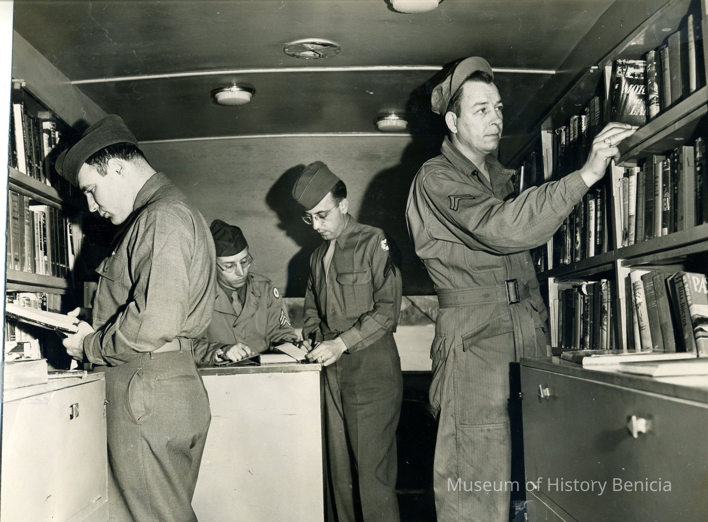 Per information sheet: "Military personnel at Benicia Arsenal draw books from a library on wheels, which visits the Arsenal on alternate weeks. The only library of its kind in the Army, the Ninth Service Command Unit services posts in this area. Books on radio are in demand at the present time states Sgt. Manning Pattilo, librarian, seated in the foreground. Left to right: Pvt. Nathan Yospe, Sgt. Pattilo, Cpl. John V. Muciaccia, Cpl. Edgar V. Tanhausen."Collection