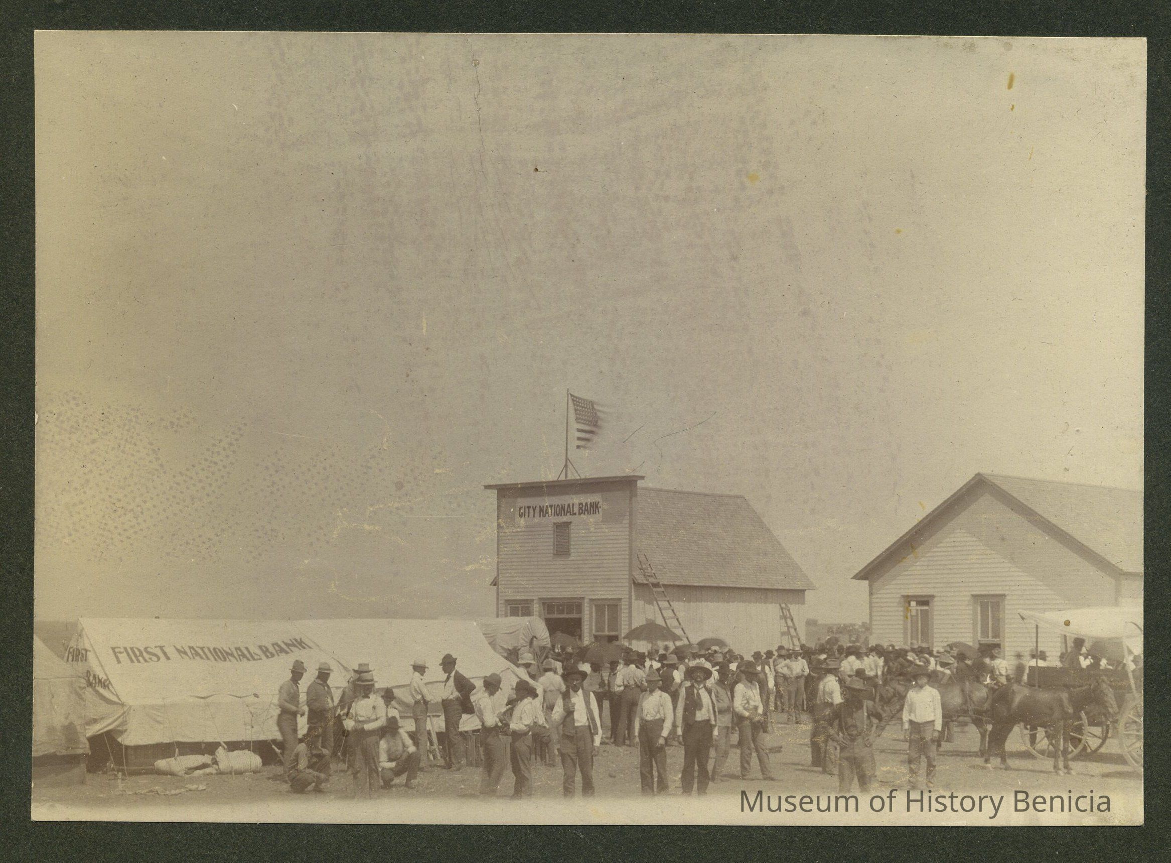 B/W Photograph glued to 5-3/4" x 10" cardboard; large group of people (mostly if not all men); a tent with a sign: "First National Bank" and two buildings, one with a sign: "City National Bank" are in the background; the location is unknown; written in ink on front of cardboard: "Our Bank 1st Nat Aug. 6, 1901; photo size: 4" x 5-1/2"